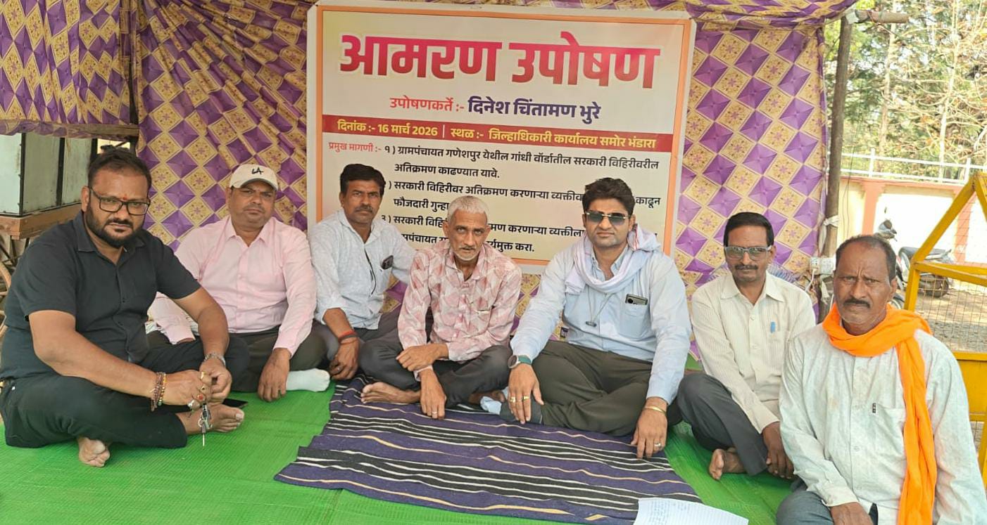 भंडारा: लगतच्या गणेशपूर येथील गांधी वॉर्डातील पुरातन सार्वजनिक विहिरीभोवती झालेल्या अतिक्रमणामुळे ग्रामस्थांना पाणी भरण्यास व येण्या-जाण्यास मोठा अडथळा निर्माण होत आहे. या गंभीर प्रश्नावर वारंवार दाद मागूनही जिल्हा प्रशासनाने कोणतीही कार्यवाही न केल्याने अखेर दिनेश चिंतामण भुरे यांनी सहकाऱ्यांसह १६ मार्च २०२६ पासून जिल्हाधिकारी कार्यालयासमोर आमरण उपोषण सुरू केले आहे.