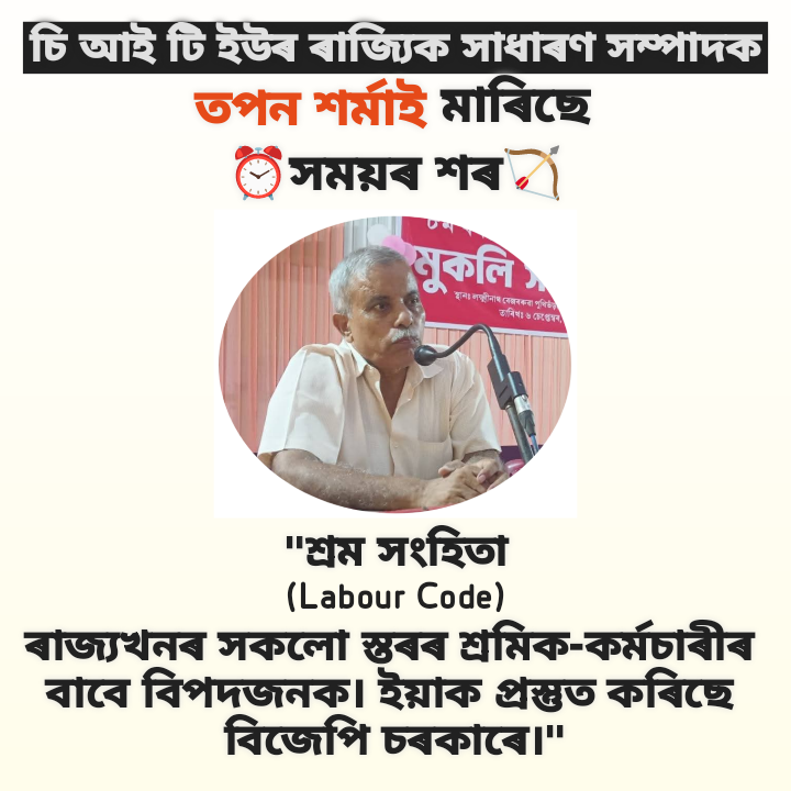 ১৮ মাৰ্চ, ২০২৬ :: অসম বিধানসভাৰ নিৰ্বাচন-২০২৬ সমাগত। বিগত সময়ছোৱাত "শ্ৰমকোড" বাতিলৰ দাবীত চেণ্টাৰ অৱ ইণ্ডিয়ান ট্ৰেড ইউনিয়নচ্ সহ শ্ৰমিক সংগঠনসমূহে ধাৰাবাহিক আন্দোলন সংগঠিত কৰিছে। শ্ৰমিক সংগঠনসমূহে অভিযোগ কৰিছে যে কেন্দ্ৰৰ শাসনত অধিষ্ঠিত চূড়ান্ত সাম্প্ৰদায়িক তথা স্বৈৰাচাৰী বিজেপি চৰকাৰে কেৱল উদ্যোগপতি মালিকৰ স্বাৰ্থসিদ্ধিৰ বাবেই সকলো প্ৰতিবাদ সত্ত্বেও শ্ৰমিক-কৰ্মচাৰীৰ স্বাৰ্থ বিৰোধী মাৰাত্মক শ্ৰমকোড কাৰ্যকৰী কৰিছে। ট্ৰেড ইউনিয়ন সমূহৰ ঐক্যমঞ্চই শ্ৰমকোড বাতিলৰ দাবীত ধাৰাবাহিক প্ৰতিবাদ অব্যাহত ৰাখিছে, আৰু আগন্তুক বিধানসভাৰ নিৰ্বাচনত স্বৈৰাচাৰী বিজেপি চৰকাৰৰ বিৰুদ্ধে ভোট প্ৰদান কৰিবলৈ সৰ্বস্তৰৰ শ্ৰমজীৱী গণতন্ত্ৰপ্ৰেমী নাগৰিকৰ প্ৰতি আহ্বান জনাইছে। তেনে সময়তে চি আই টি ইউৰ ৰাজ্যিক সাধাৰণ সম্পাদক তপন শৰ্মাই সময়ৰ শৰ মাৰিছে— "শ্ৰম সংহিতা (Labour Code) ৰাজ্যখনৰ সকলো স্তৰৰ শ্ৰমিক-কৰ্মচাৰীৰ বাবে বিপদজনক। ইয়াক প্ৰস্তুত কৰিছে বিজেপি চৰকাৰে।"