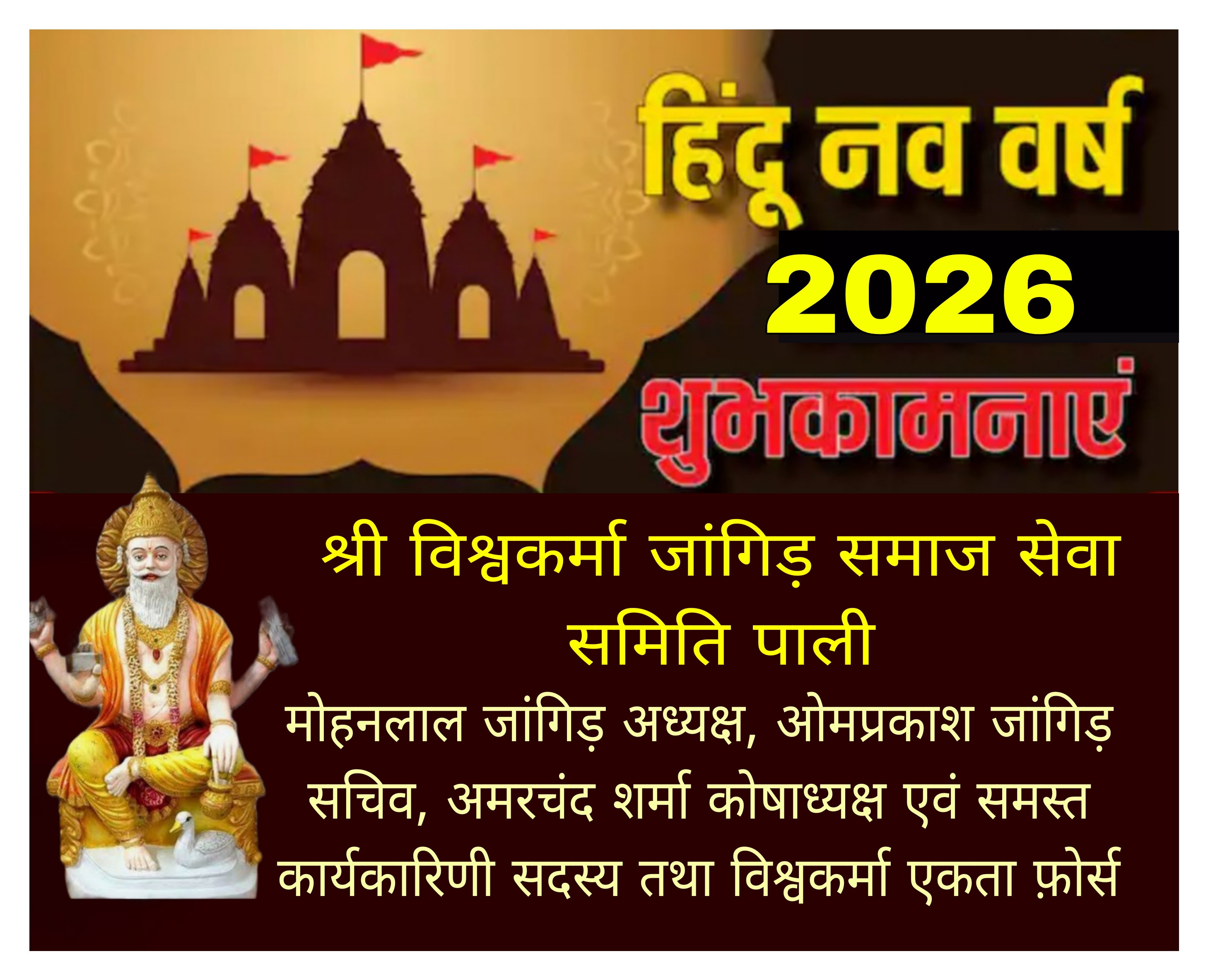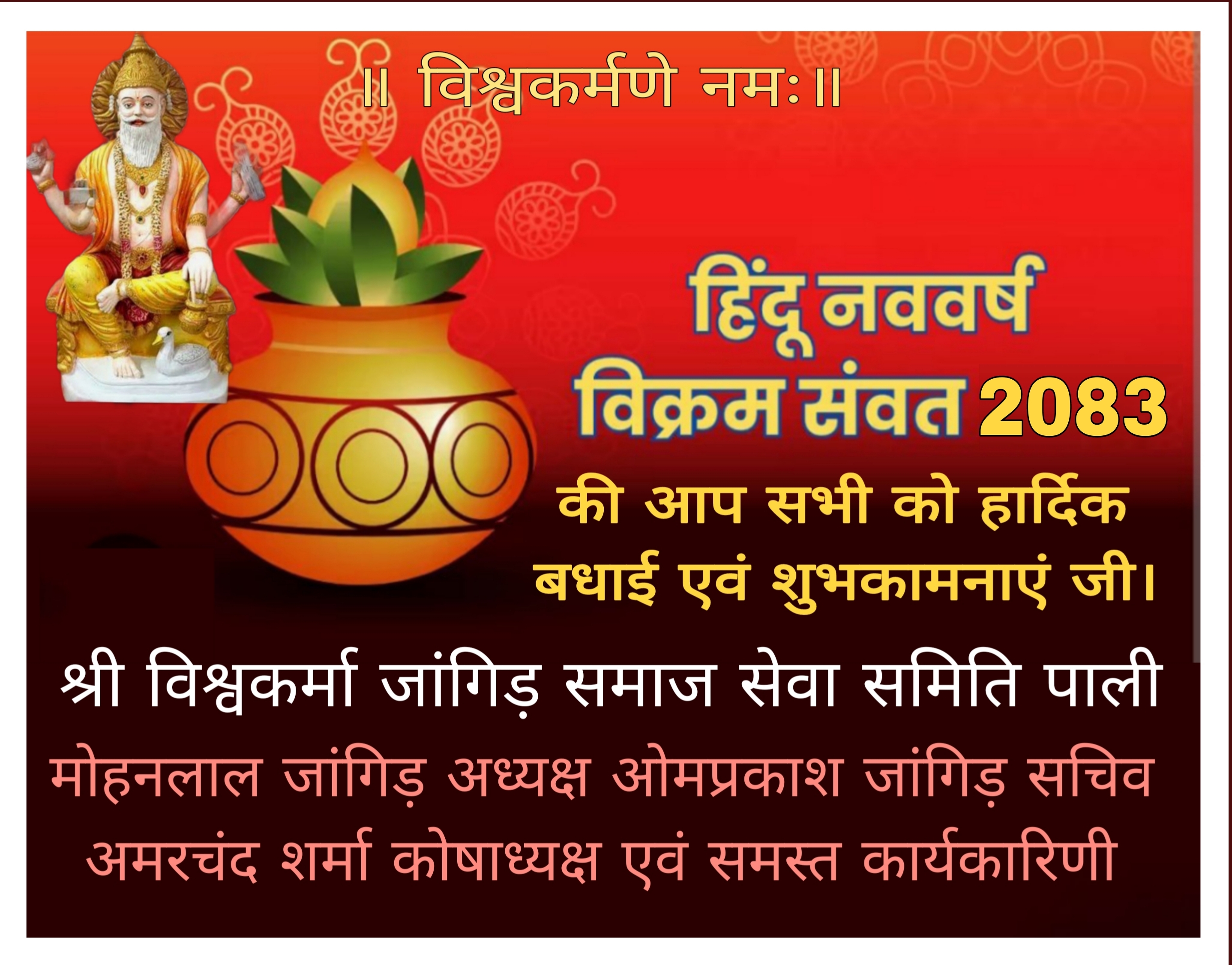 उन्होंने नववर्ष 2083 की समस्त देशवासियों को शुभकामनाएं देते हुए कहा कि भारतीय नववर्ष सबके लिए सुखदायक हो । इस अवसर पर समिति सचिव ओमप्रकाश जांगिड़ एवं कोषाध्यक्ष अमरचंद शर्मा के नेतृत्व में भगवान विश्वकर्मा की पूजा अर्चना की गई। जिसमें समाज के बड़े बुजुर्गो के अलावा विश्वकर्मा एकता फ़ोर्स के कार्यकर्ता मोजूद रहे।