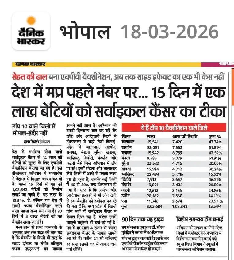 देश में मध्यप्रदेश पहले नंबर पर, 15 दिन में एक लाख बेटियों को सर्वाइकल कैंसर का टीका