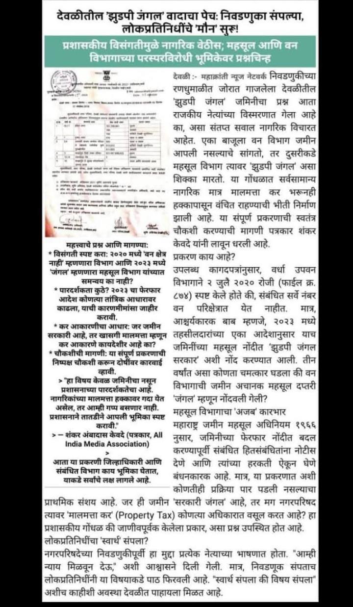 рдореА, рд╢рдВрдХрд░ рдЕрдВрдмрд╛рджрд╛рд╕ рдХреЗрд╡рджреЗ, рд░рд╛. рдЗрдВрджрд┐рд░рд╛рдирдЧрд░, рд╡реЙрд░реНрдб рдХреНрд░. 16, рджреЗрд╡рд│реА, рдпрд╛рдВрджреНрд╡рд╛рд░реЗ рд╣реЗ рдЬрд╛рд╣реАрд░ рдХрд░рддреЛ рдХреА, рдореА рд╕рди 2013 рдкрд╛рд╕реВрди рдирдЧрд░рдкрд░рд┐рд╖рджреЗрдХрдбреЗ рдирд┐рдпрдорд┐рддрдкрдгреЗ рдШрд░рдкрдЯреНрдЯреА (Property Tax) рднрд░рдд рдЕрд╕реВрди, рддреНрдпрд╛рдкреВрд░реНрд╡реАрд╣реА рд╕рдВрдмрдВрдзрд┐рдд рдЬрд╛рдЧреЗрд╕рд╛рдареА рднрд╛рдбреЗрдкрдЯреНрдЯреА рдЕрджрд╛ рдХрд░рдд рд╣реЛрддреЛ. рдпрд╛рд╡рд░реВрди рдорд╛рдЭреЗ рддреНрдпрд╛ рдЬрд╛рдЧреЗрд╡рд░реАрд▓ рд╡рд╛рд╕реНрддрд╡реНрдп рд╡ рдХрд░рджрд╛рдпрд┐рддреНрд╡ рдирдЧрд░рдкрд░рд┐рд╖рджреЗрдХрдбреВрди рдорд╛рдиреНрдп рдХреЗрд▓реЗрд▓реЗ рдЖрд╣реЗ.