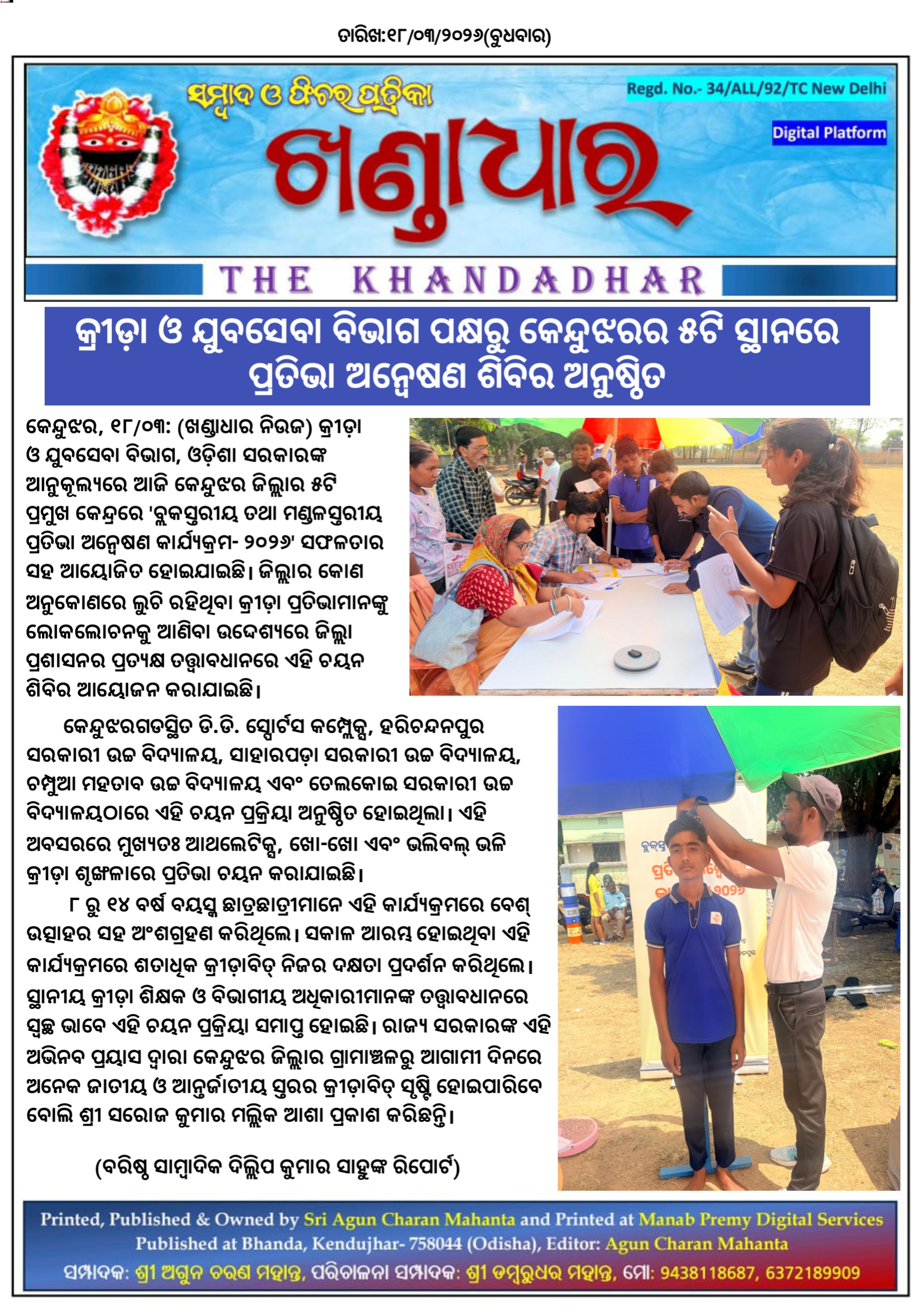 କ୍ରୀଡ଼ା ଓ ଯୁବସେବା ବିଭାଗ ପକ୍ଷରୁ କେନ୍ଦୁଝରର ୫ଟି ସ୍ଥାନରେ ପ୍ରତିଭା ଅନ୍ୱେଷଣ ଶିବିର ଅନୁଷ୍ଠିତ।