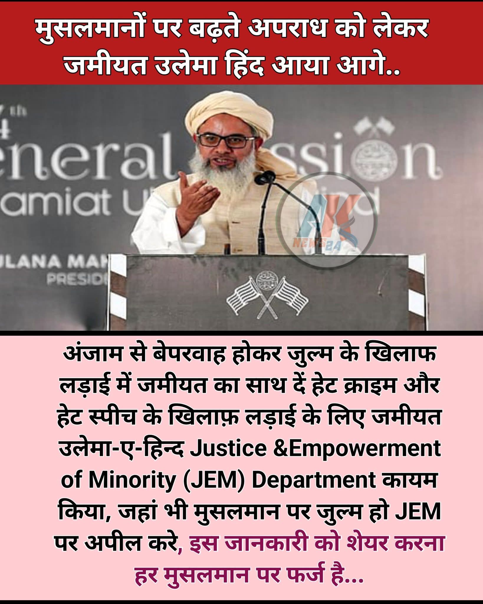 नफरत के खिलाफ अब जमीयत उलेमा-ए-हिंद ने आर-पार की जंग का ऐलान कर दिया है। हेट क्राइम और हेट स्पीच की बढ़ती घटनाओं को रोकने के लिए ‘JEM’ (Justice & Emp