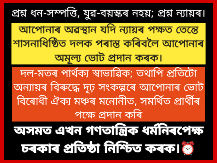 ন্যায়ৰ পক্ষে, সাম্প্ৰদায়িক বিভাজনবাদী তথা স্বৈৰাচাৰী শক্তিক পৰাস্ত কৰাৰ পক্ষে ভোটদান— এক বিশেষ পোষ্ট।