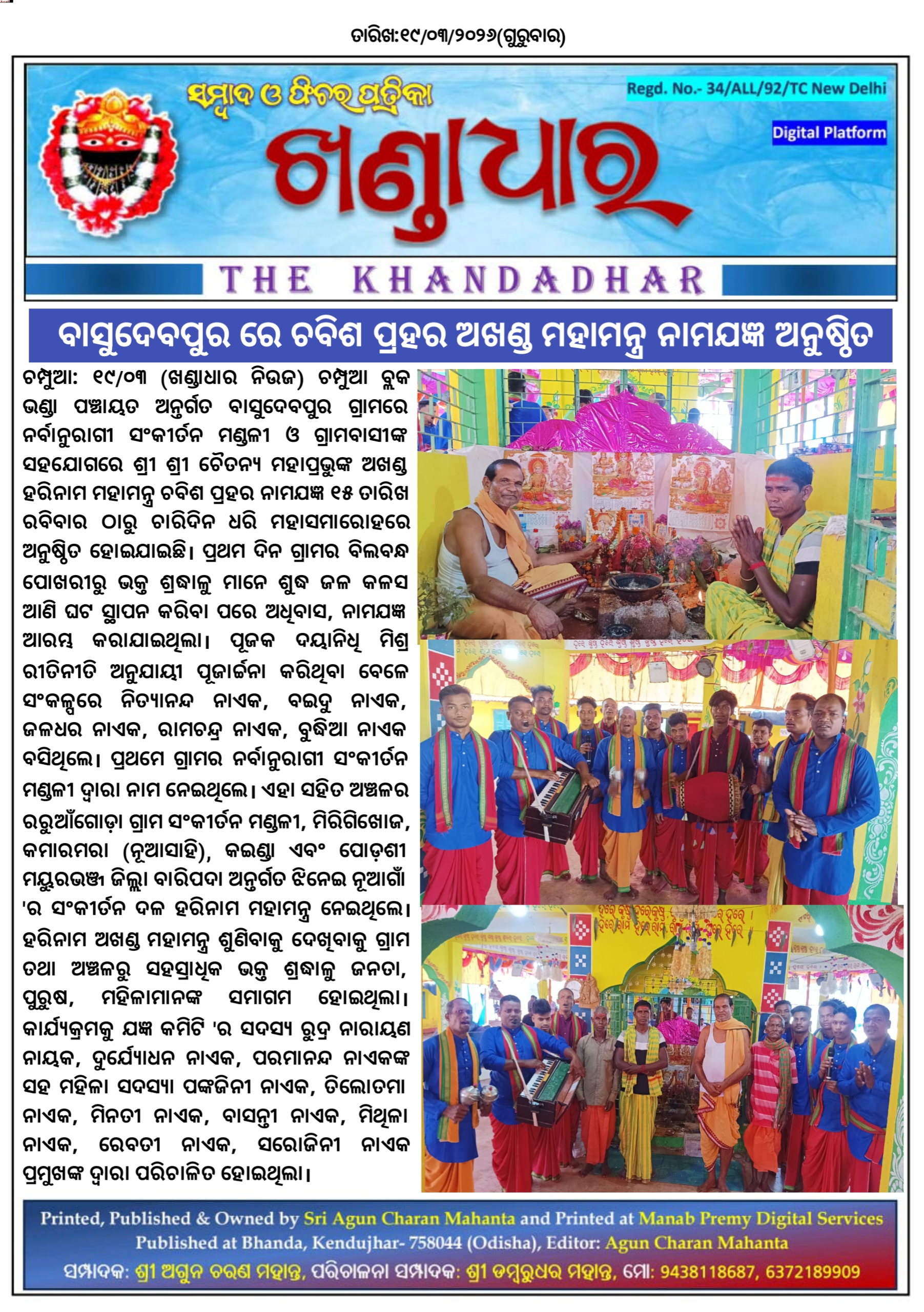 ଚମ୍ପୁଆ -୧୯/୦୩ (ଖଣ୍ଡାଧାର ନିଉଜ)ଚମ୍ପୁଆ ବ୍ଲକ ଭଣ୍ଡା ପଞ୍ଚାୟତ ଅନ୍ତର୍ଗତ ବାସୁଦେବପୁର ଗ୍ରାମରେ ନର୍ବାନୁରାଗୀ ସଂକୀର୍ତନ ମଣ୍ଡଳୀ ଓ ଗ୍ରାମବାସୀଙ୍କ ସହଯୋଗରେ ଶ୍ରୀ ଶ୍ରୀ ଚୈତନ୍ୟ ମହାପ୍ରଭୁଙ୍କ ଅଖଣ୍ଡ ହରିନାମ ମହାମନ୍ତ୍ର ଚବିଶ ପ୍ରହର ନାମଯଜ୍ଞ ୧୫ ତାରିଖ ରବିବାର ଠାରୁ ଚାରିଦିନ ଧରି ମହାସମାରୋହରେ ଅନୁଷ୍ଠିତ ହୋଇଯାଇଛି l ପ୍ରଥମ ଦିନ ଗ୍ରାମର ବିଲବନ୍ଧ ପୋଖରୀରୁ ଭକ୍ତ ଶ୍ରଦ୍ଧାଳୁ ମାନେ ଶୁଦ୍ଧ ଜଳ କଳସ ଆଣି ଘଟ ସ୍ଥାପନ କରିବା ପରେ ଅଧିବାସ, ନାମଯଜ୍ଞ ଆରମ୍ଭ କରାଯାଇଥିଲା l ପୂଜକ ଦୟାନିଧି ମିଶ୍ର ରୀତିନୀତି ଅନୁଯାୟୀ ପୂଜାର୍ଚ୍ଚନା କରିଥିବା ବେଳେ ସଂକଳ୍ପରେ ନିତ୍ୟାନନ୍ଦ ନାଏକ, ବଇଦୁ ନାଏକ, ଜଳଧର ନାଏକ, ରାମଚନ୍ଦ୍ର ନାଏକ, ବୁଦ୍ଧିଆ ନାଏକ ବସିଥିଲେ l ପ୍ରଥମେ ଗ୍ରାମର ନର୍ବାନୁରାଗୀ ସଂକୀର୍ତନ ମଣ୍ଡଳୀ ଦ୍ଵାରା ନାମ ନେଇଥିଲେ l ଏହା ସହିତ ଅଞ୍ଚଳର ରରୁଆଁଗୋଡ଼ା ଗ୍ରାମ ସଂକୀର୍ତନ ମଣ୍ଡଳୀ, ମିରିଗିଖୋଜ, କମାରମରା (ନୂଆସାହି), କଇଣ୍ଡା ଏବଂ ପୋଡ଼ଶୀ ମୟୁରଭଞ୍ଜ ଜିଲ୍ଲା ବାରିପଦା ଅନ୍ତର୍ଗତ ଝିନେଇ ନୂଆଗାଁ 'ର ସଂକୀର୍ତନ ଦଳ ହରିନାମ ମହାମନ୍ତ୍ର ନେଇଥିଲେ l ହରିନାମ ଅଖଣ୍ଡ ମହାମନ୍ତ୍ର ଶୁଣିବାକୁ ଦେଖିବାକୁ ଗ୍ରାମ ତଥା ଅଞ୍ଚଳରୁ ସହସ୍ରାଧିକ ଭକ୍ତ ଶ୍ରଦ୍ଧାଳୁ ଜନତା, ପୁରୁଷ, ମହିଳାମାନଙ୍କ ସମାଗମ ହୋଇଥିଲା l କାର୍ଯ୍ୟକ୍ରମକୁ ଯଜ୍ଞ କମିଟି 'ର ସଦସ୍ୟ ରୁଦ୍ର ନାରାୟଣ ନାୟକ, ଦୁର୍ଯ୍ୟୋଧନ ନାଏକ, ପରମାନନ୍ଦ ନାଏକଙ୍କ ସହ ମହିଳା ସଦସ୍ୟା ପଙ୍କଜିନୀ ନାଏକ, ତିଲୋତମା ନାଏକ, ମିନତୀ ନାଏକ, ବାସନ୍ତୀ ନାଏକ, ମିଥିଳା ନାଏକ, ରେବତୀ ନାଏକ, ସରୋଜିନୀ ନାଏକ ପ୍ରମୁଖଙ୍କ ଦ୍ଵାରା ପରିଚାଳିତ ହୋଇଥିଲା l