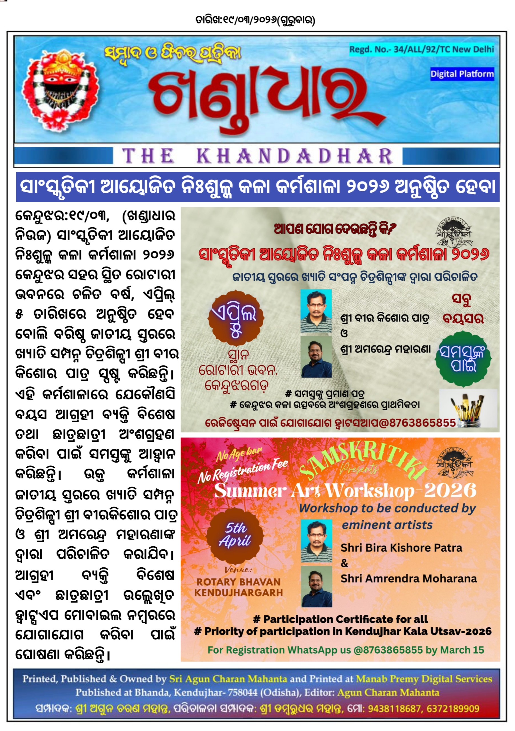 କେନ୍ଦୁଝର:୧୯/୦୩, (ଖଣ୍ଡାଧାର ନିଉଜ) ସାଂସ୍କୃତିକୀ ଆୟୋଜିତ ନିଃଶୁଳ୍କ କଳା କର୍ମଶାଳା ୨୦୨୬ କେନ୍ଦୁଝର ସହର ସ୍ଥିତ ରୋଟାରୀ ଭବନରେ ଚଳିତ ବର୍ଷ, ଏପ୍ରିଲ୍ ୫ ତାରିଖରେ ଅନୁଷ୍ଠିତ ହେବ ବୋଲି ବରିଷ୍ଠ ଜାତୀୟ ସ୍ତରରେ ଖ୍ୟାତି ସମ୍ପନ୍ନ ଚିତ୍ରଶିଳ୍ପୀ ଶ୍ରୀ ବୀର କିଶୋର ପାତ୍ର ସ୍ପଷ୍ଟ କରିଛନ୍ତି। ଏହି କର୍ମଶାଳାରେ ଯେକୌଣସି ବୟସ ଆଗ୍ରହୀ ବ୍ଯକ୍ତି ବିଶେଷ ତଥା ଛାତ୍ରଛାତ୍ରୀ ଅଂଶଗ୍ରହଣ କରିବା ପାଇଁ ସମସ୍ତଙ୍କୁ ଆହ୍ବାନ କରିଛନ୍ତି। ଉକ୍ତ କର୍ମଶାଳା ଜାତୀୟ ସ୍ତରରେ ଖ୍ୟାତି ସମ୍ପନ୍ନ ଚିତ୍ରଶିଳ୍ପୀ ଶ୍ରୀ ବୀରକିଶୋର ପାତ୍ର ଓ ଶ୍ରୀ ଅମରେନ୍ଦ୍ର ମହାରଣାଙ୍କ ଦ୍ବାରା ପରିଚାଳିତ କରାଯିବ। ଆଗ୍ରହୀ ବ୍ଯକ୍ତି ବିଶେଷ ଏବଂ ଛାତ୍ରଛାତ୍ରୀ ଉଲ୍ଲେଖିତ ହ୍ବାଟ୍ସଏପ ମୋବାଇଲ ନମ୍ବରରେ ଯୋଗାଯୋଗ କରିବା ପାଇଁ ଘୋଷଣା କରିଛନ୍ତି।