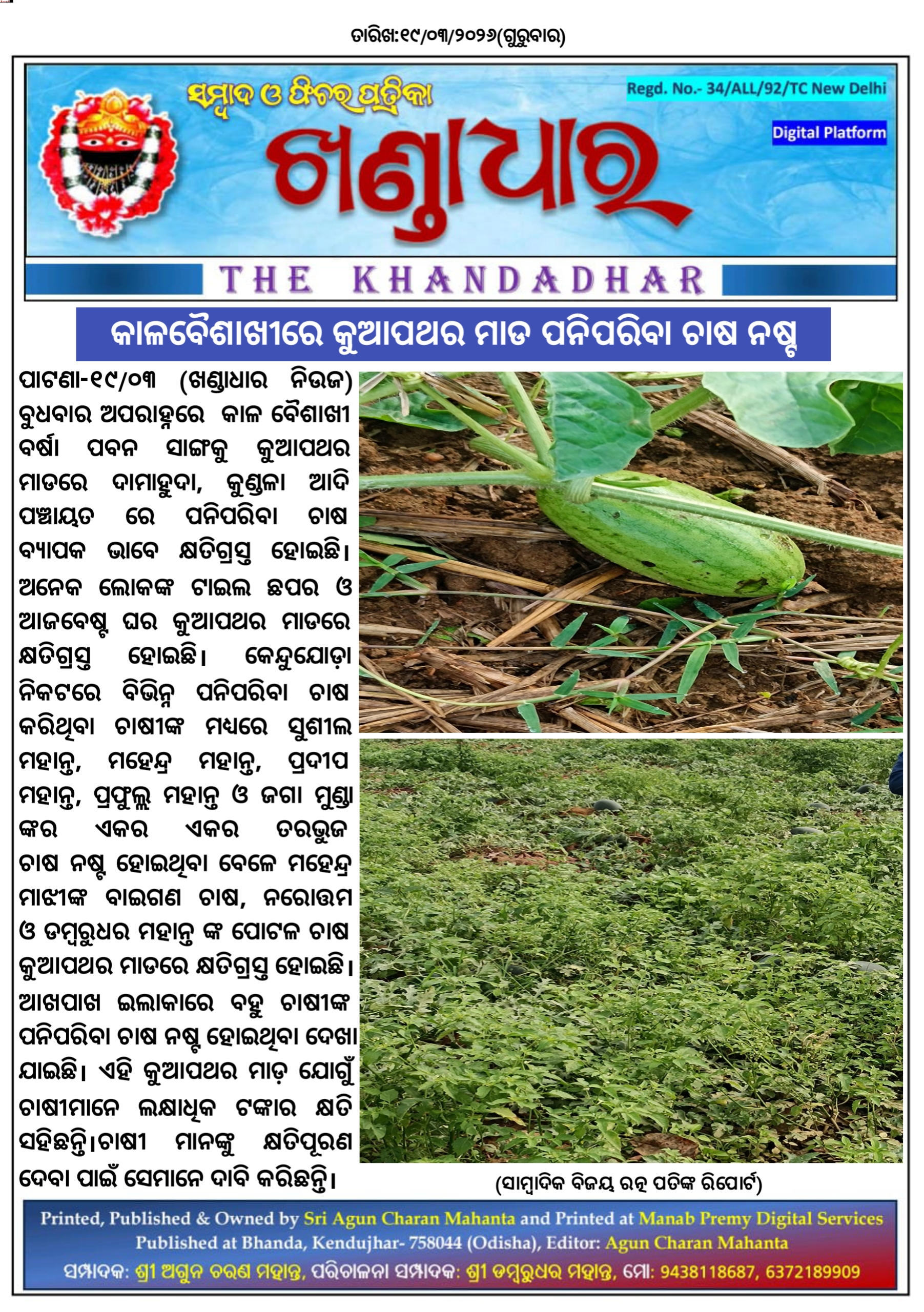 କାଳବୈଶାଖୀରେ କୁଆପଥର ମାଡ ପନିପରିବା ଚାଷ ନଷ୍ଟ।