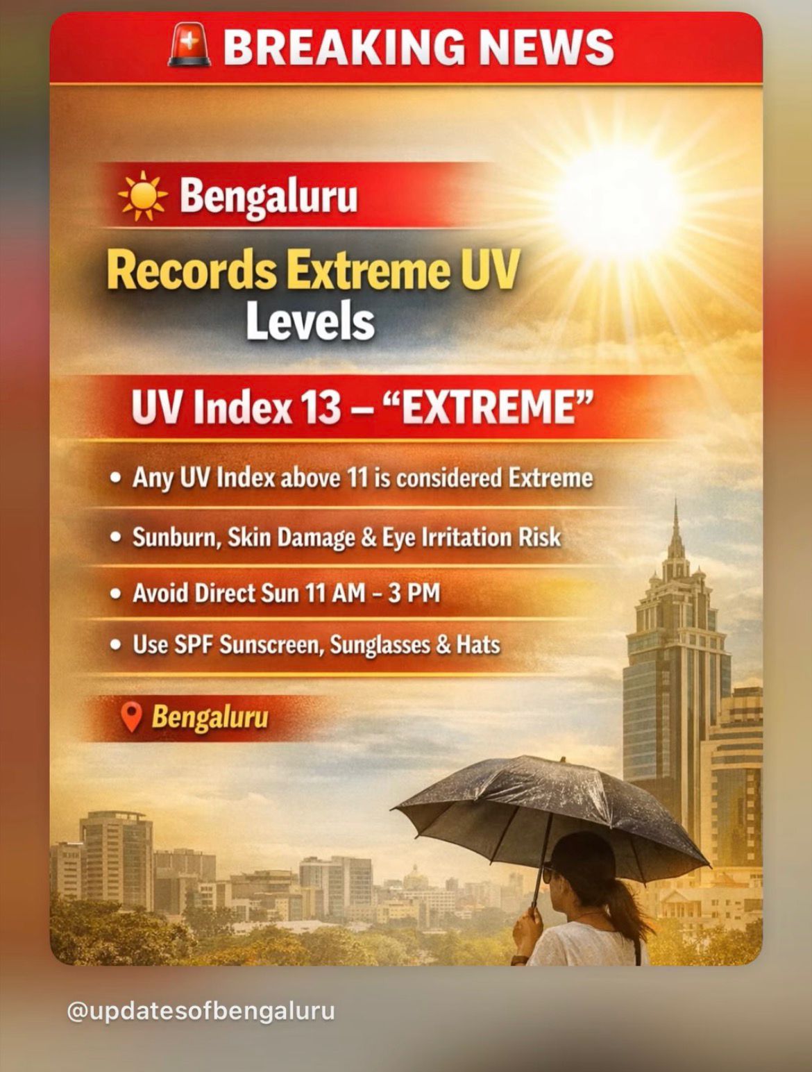 Bengaluru is experiencing extreme ultraviolet radiation levels with a UV Index of 13. Any value above 11 falls in the highest risk category, which means sun exposure can quickly cause skin damage, sunburn, and eye irritation.