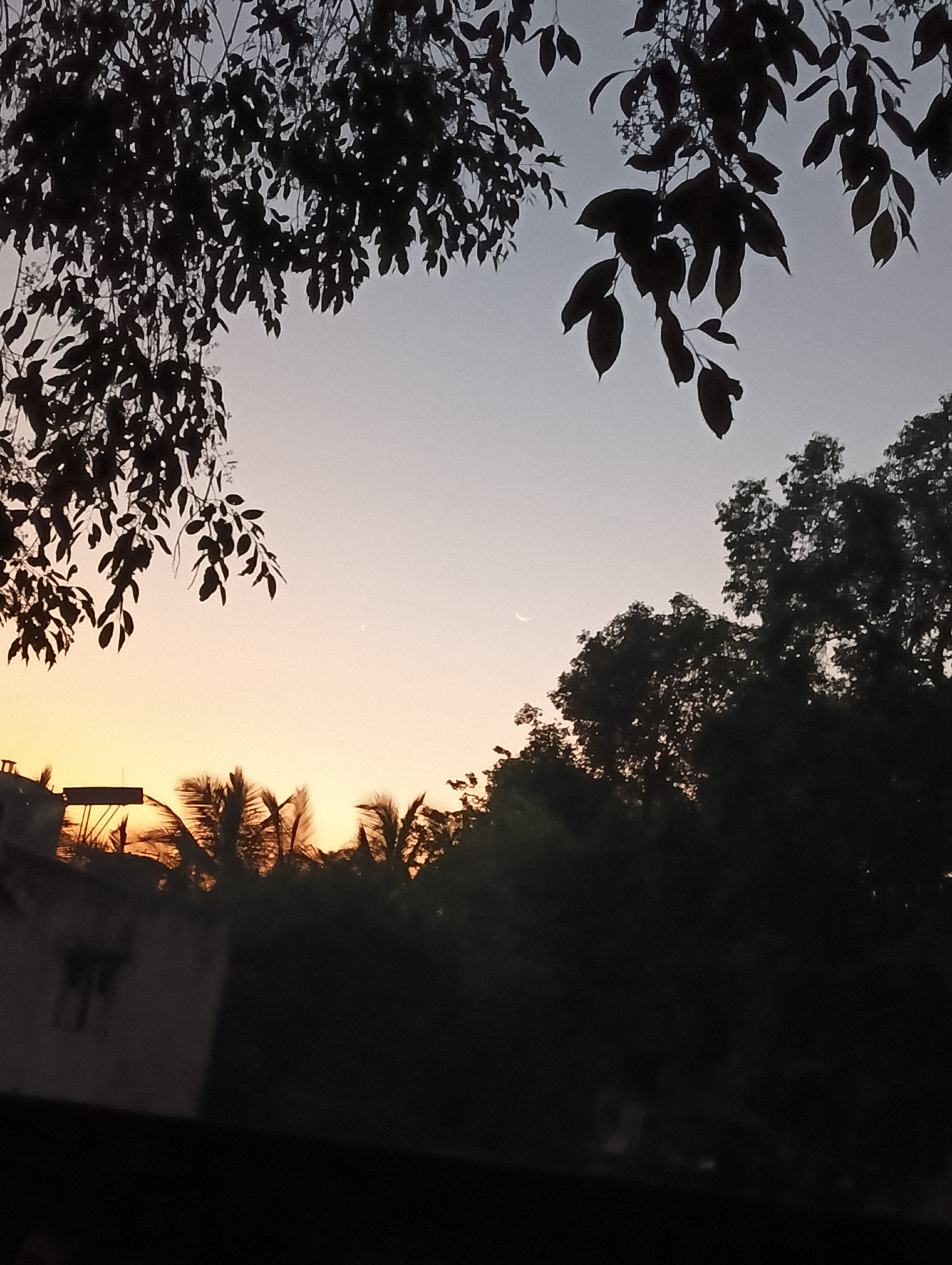 આ સુંદર દૃશ્યમાં ઝાડોની વચ્ચે આકાશમાં ચમકતો ચાંદ ઈદના આગમનની ખુશખબર આપી રહ્યો છે. સમગ્ર વિસ્તારમાં આનંદ અને ઉત્સાહનો માહોલ જોવા મળી રહ્યો છે.
