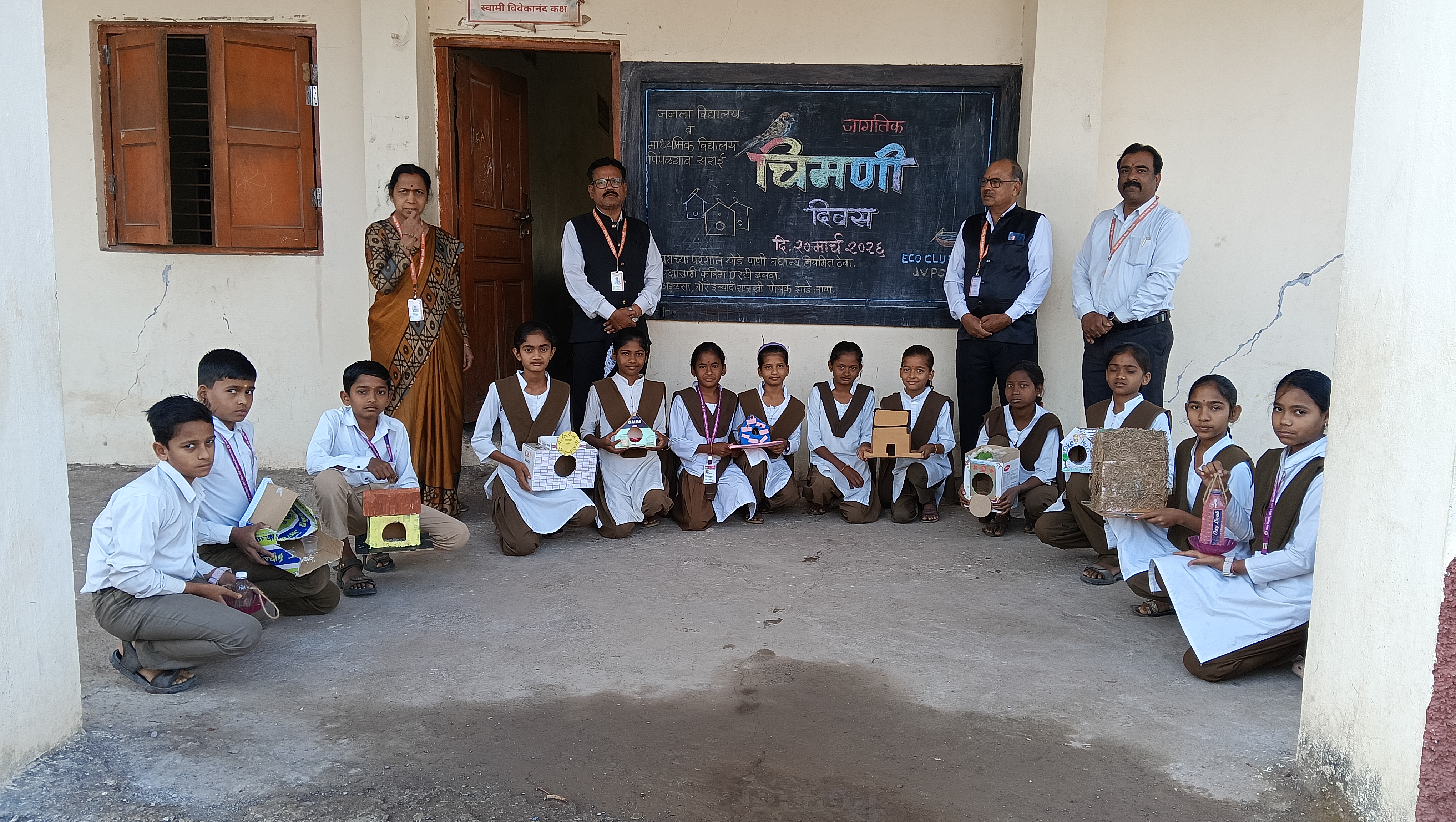 या निमित्ताने विद्यार्थ्यांनी “टाकाऊ पासून टिकाऊ” या संकल्पनेवर आधारित उपक्रम राबवत टाकाऊ वस्तूंमधून आकर्षक व उपयुक्त अशी चिमण्यांची घरटी तयार केली. विद्यार्थ्यांच्या या सर्जनशील उपक्रमाने उपस्थितांचे लक्ष वेधून घेतले. पर्यावरणपूरक जीवनशैलीचा संदेश देत विद्यार्थ्यांनी आपल्या घरी व परिसरात अशा घरट्यांची उभारणी करण्याचा निर्धार व्यक्त केला.