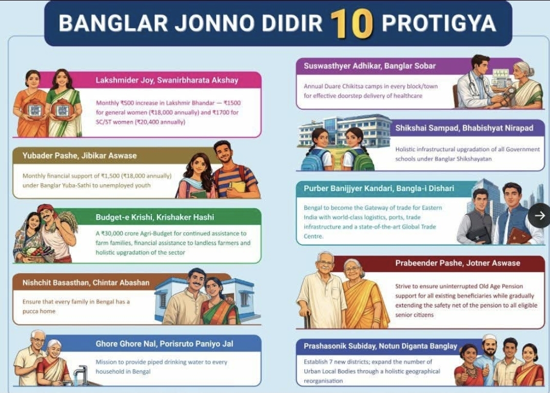 कोलकाता :- पश्चिम बंगाल विधानसभा चुनाव 2026 के लिए मुख्यमंत्री और TMC प्रमुख ममता बनर्जी ने पार्टी का चुनावी घोषणापत्र जारी कर दिया है, जिसमें '10 शपथ' के जरिए राज्य की जनता से बड़े वादे किए गए हैं। इस घोषणापत्र की सबसे बड़ी विशेषता 'द्वारे चिकित्सा' योजना है, जिसके तहत अब हर बूथ और ब्लॉक स्तर पर शिविर लगाकर लोगों के घर-द्वार तक मुफ्त चिकित्सा सुविधा पहुंचाई जाएगी। स्वास्थ्य सेवाओं के साथ-साथ शिक्षा के क्षेत्र में भी बड़े बदलाव का संकल्प लेते हुए मुख्यमंत्री ने हजारों सरकारी स्कूलों को ई-लर्निंग सुविधाओं से लैस कर उन्हें आधुनिक बनाने की बात कही है। इसके अलावा, प्रशासनिक कार्यक्षमता बढ़ाने के लिए राज्य में 7 से 8 नए जिले, ब्लॉक और नई नगर पालिकाएं बनाने का भी लक्ष्य रखा गया है। महिलाओं और युवाओं के लिए वित्तीय सहायता को और अधिक आकर्षक बनाते हुए मुख्यमंत्री ममता बनर्जी ने 'लक्ष्मी भंडार' योजना के तहत मिलने वाली राशि में 500 रुपये की बढ़ोतरी का ऐलान किया है। अब सामान्य वर्ग की महिलाओं को मासिक 1,500 रुपये और एससी/एसटी वर्ग की महिलाओं को 2,0400 रुपये सालाना की सहायता मिलेगी। बेरोजगार युवाओं के लिए 'युवा साथी' योजना के तहत 1,500 रुपये प्रति माह की मदद जारी रहेगी। कृषि क्षेत्र को मजबूती देने के लिए TMC ने 30,000 करोड़ रुपये के विशेष कृषि बजट का प्रावधान करने का वादा किया है, जिससे भूमिहीन किसानों और कृषि परिवारों को सीधा लाभ मिलेगा। मुख्यमंत्री ने स्पष्ट किया कि उनकी सरकार जन-कल्याणकारी योजनाओं के माध्यम से बंगाल के हर वर्ग का सर्वांगीण विकास सुनिश्चित करेगी।