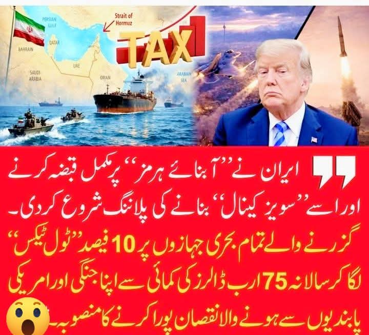 ایران نے"آبنائے ہرمز" پر مکمل قبضہ کرنے اور اسے"سویز کینال" بنانے کی پلاننگ شروع کر دی۔ گزرنے والے تمام بحری جہازوں پر 10 فیصد "ٹول ٹیکس" لگا کر سالانہ 75 ارب ڈالرز کی کمائی سے اپنا جنگی اور امریکی پابندیوں سے ہونے والا نقصان پورا کرنے کا منصوبہ بنایا ہے یقینا یہ اقدام ایران اور ایرانی عوام کے لیے باعث مسرت ہوگا اسے ایران کی معیشت بہتر ہوگی اور عوام ایران میں خوشحالی کے سفر کا آغاز ہوگا