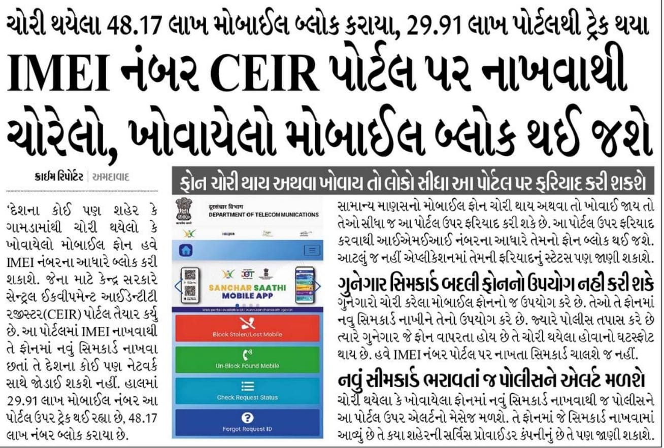 IMEI નંબર CEIR પોર્ટલ પર નાખવાથી ચોરી થયેલ મોબાઇલ બ્લોક થઈ જશે