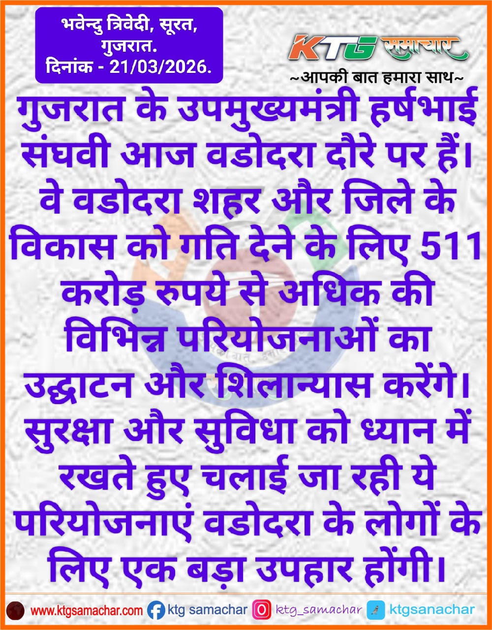 गुजरात के उपमुख्यमंत्री हर्ष संघवी आज बड़ोदरा दौरे पर है।