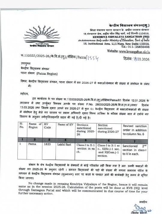केंद्रीय विद्यालय संगठन के पटना क्षेत्रीय कार्यालय द्वारा जारी आदेश के अनुसार सत्र 2026-27 से स्कूलों में कक्षाओं/सेक्शनों की संख्या में संशोधन किया गया है। इस आदेश के तहत लखीसराय स्थित केन्द्रीय विद्यालय में भी महत्वपूर्ण बदलाव किए गए हैं, पहले सत्र 2025-26 में कक्षा एक से 10 तक केवल एक-एक सेक्शन था