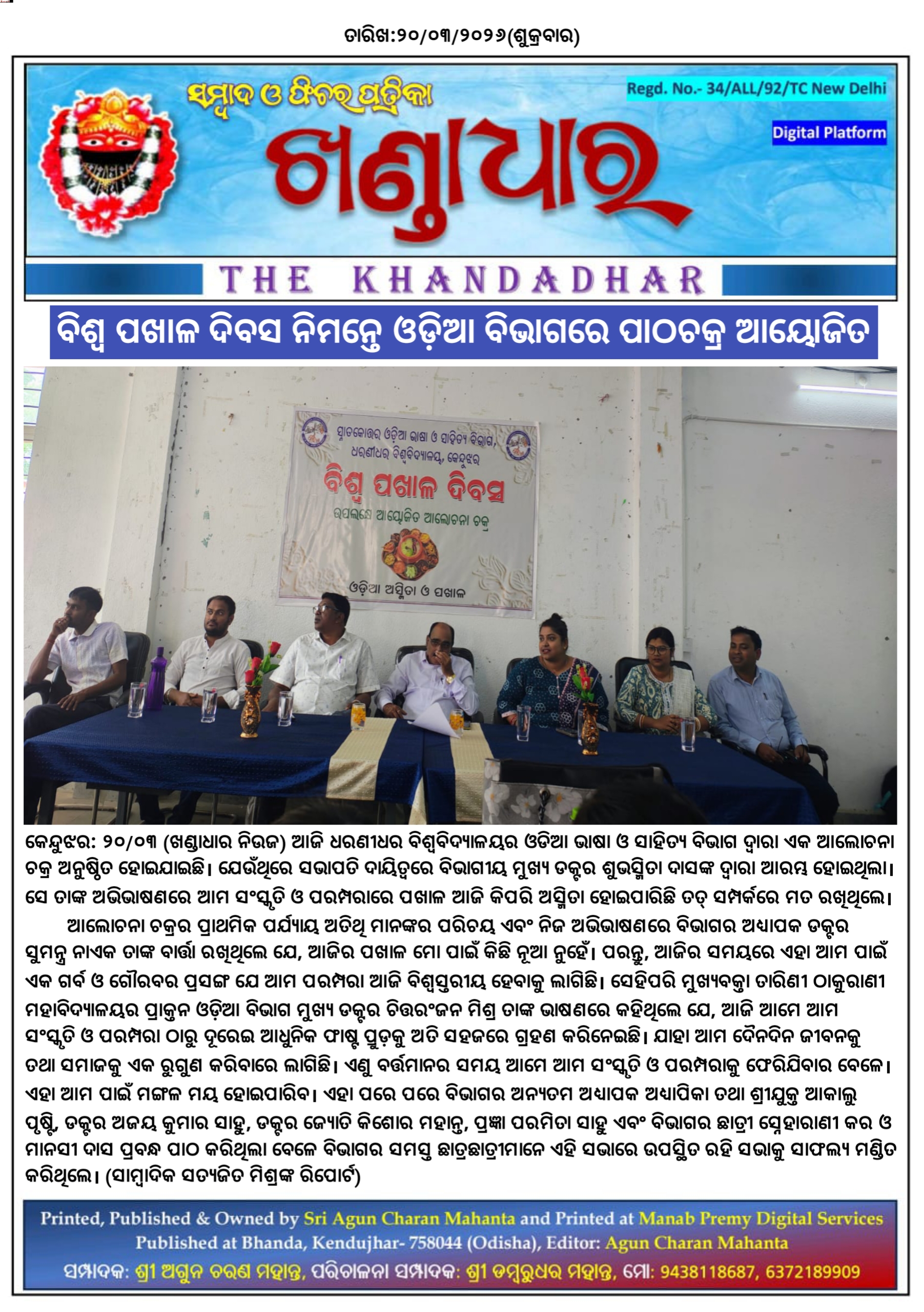 ବିଶ୍ୱ ପଖାଳ ଦିବସ ନିମନ୍ତେ ଓଡ଼ିଆ ବିଭାଗରେ ପାଠଚକ୍ର ଆୟୋଜିତ।