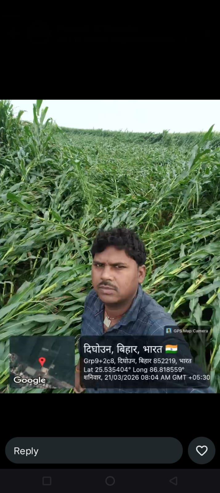 गांव के हीं सुरेश मिस्त्री जब सबेरे - सबेरे अपने खेत में लगे मक्का का फसल देखने पहुंचा तो खेत में मक्का के फसल नुकसान होते हुए देखकर काफी निराश हो हो गये। गाँव के हीं और अन्य किसान तारो मिस्त्री, पिंटू कुमार साहनी,चनकिशोर मिस्त्री रोहित मिस्त्री, रुदल मिस्त्री महादेव मिस्त्री, गोवर्धन,मिस्त्री, कैलाश मंडस, प्रकाश मंडस, साहेब मंडल, साहेब मिस्त्री , जीतन मिस्त्री बबलू मिस्त्री, व गाँव के, अनेको किसानों का फसल आंधी - तुफान व बरीश के कारण क्षतिग्रस्त हो गया है ।