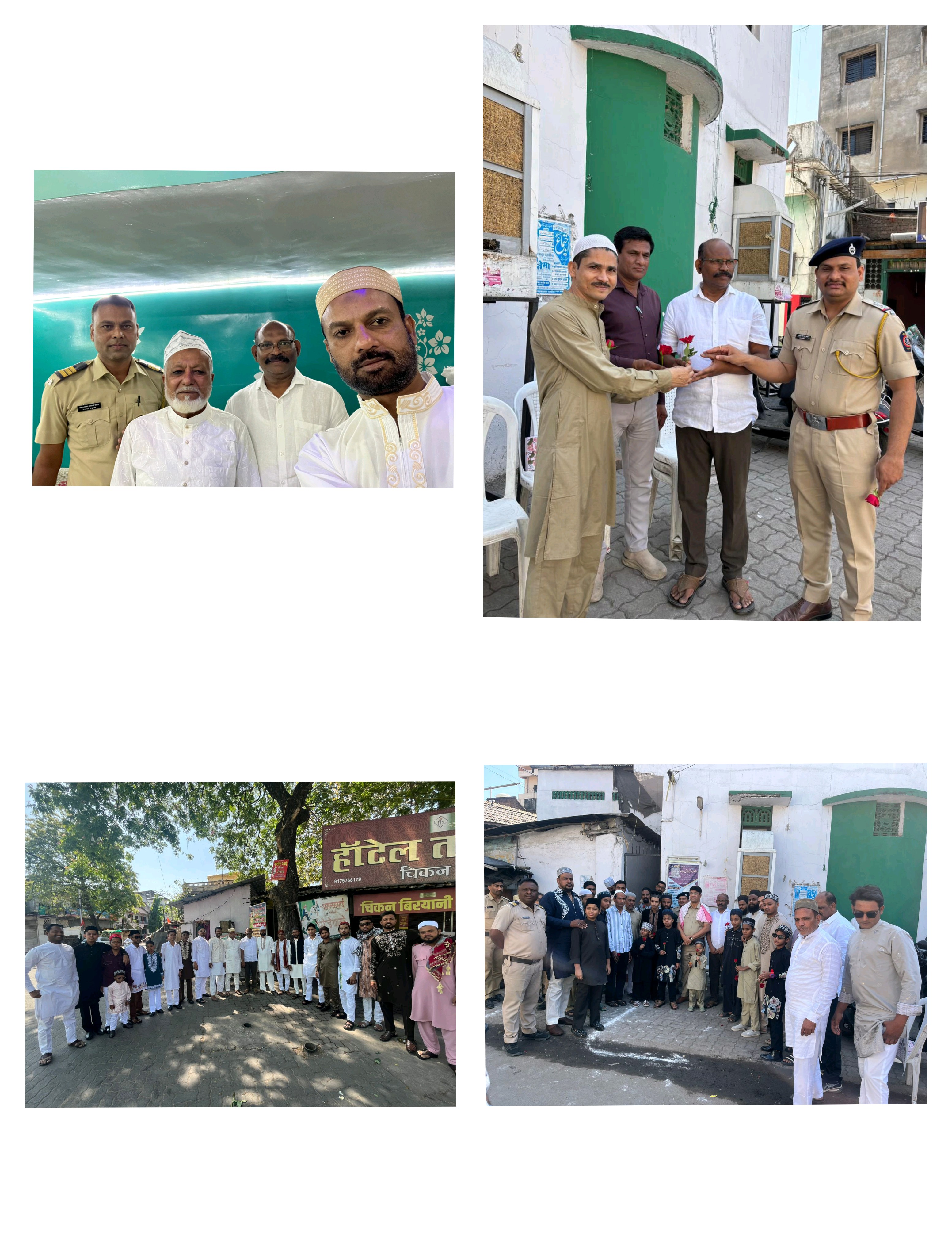 याप्रसंगी मा अरूण क्षिरसागर पोलीस निरीक्षक लकडगंज मा विनोद इंगोले समाजसेवक मा कामळे पोलीस उपनिरीक्षक मा परमारजी मा पडोळेजी, झाडेजी , किरण सुरसे व शफीक भाई, अध्यक मजीद भाई ,रियाज भाई मुस्ताक भाई, अफजल भाई ,गुड्डू भाई ,तहसीन रजा हसन रजा सफी भाई फरहान रजा सर्व मुस्लिम बांधवाना ईद निमित्त गुलाबाचे फुल व मिठाई देवुन शुभेच्छा देण्यात आल्या.