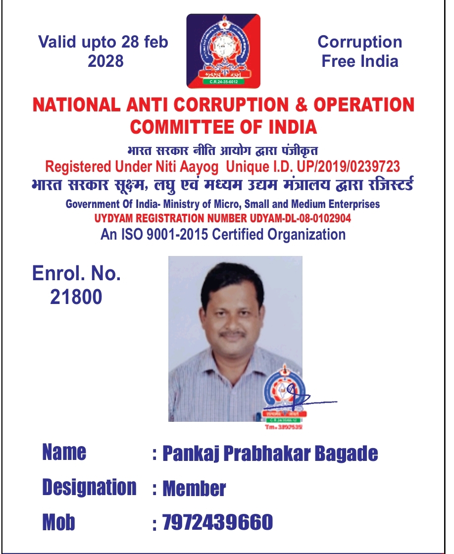 National Anti Corruption & Operation Committee of India या संस्थेमध्ये पंकज प्रभाकर बागडे यांची सदस्य म्हणून निवड झाल्याबद्दल परिसरातून त्यांचेअभिनंदन