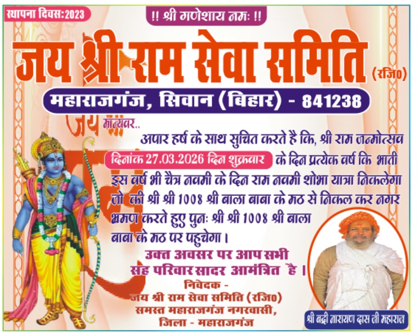 स्थापना दिवसः 2023 !! श्री गणेशाय नमः !! जय श्री राम सेवा समिति रजि०.. महाराजगंज, सिवान (बिहार) - 841238