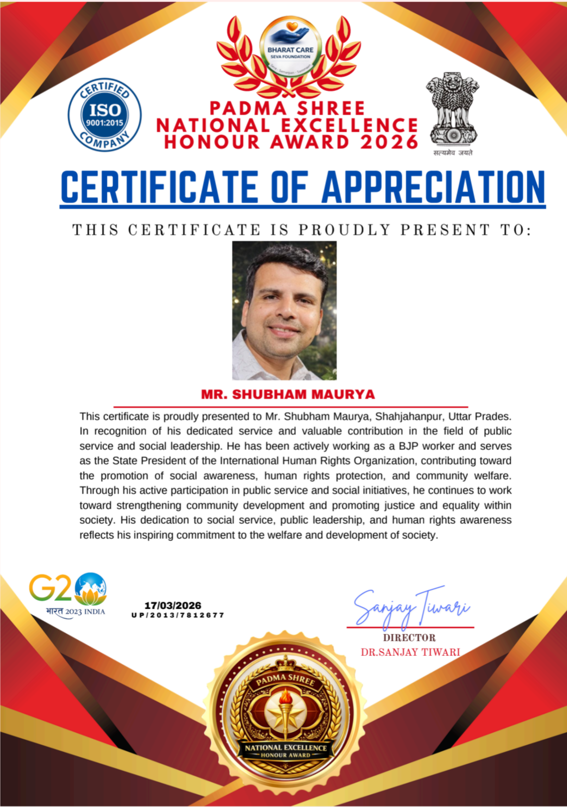 समाज सेवा और जनहित के कार्यों में सक्रिय युवा चेहरा शुभम मौर्य आज जिले ही नहीं, बल्कि प्रदेश स्तर पर अपनी अलग पहचान बना रहे हैं। आवास विकास, शाहजहाँपुर निवासी शुभम मौर्य, जो एक भाजपा कार्यकर्ता होने के साथ-साथ अंतरराष्ट्रीय मानवाधिकार संगठन में उत्तर प्रदेश के प्रदेश अध्यक्ष भी हैं, पिछले चार वर्षों से लगातार जनसेवा के कार्यों में जुटे हुए हैं।