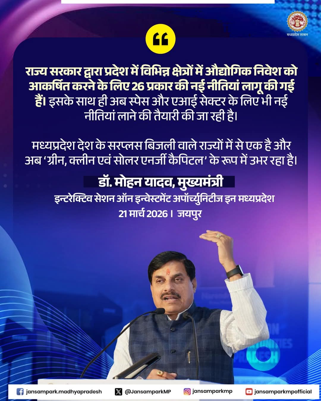 Dr Mohan Yadav CM Madhya Pradesh Industry Policy & Investment Promotion Department #MadhyaPradesh #InvestMPInJaipur #InvestMP #JansamparkMP