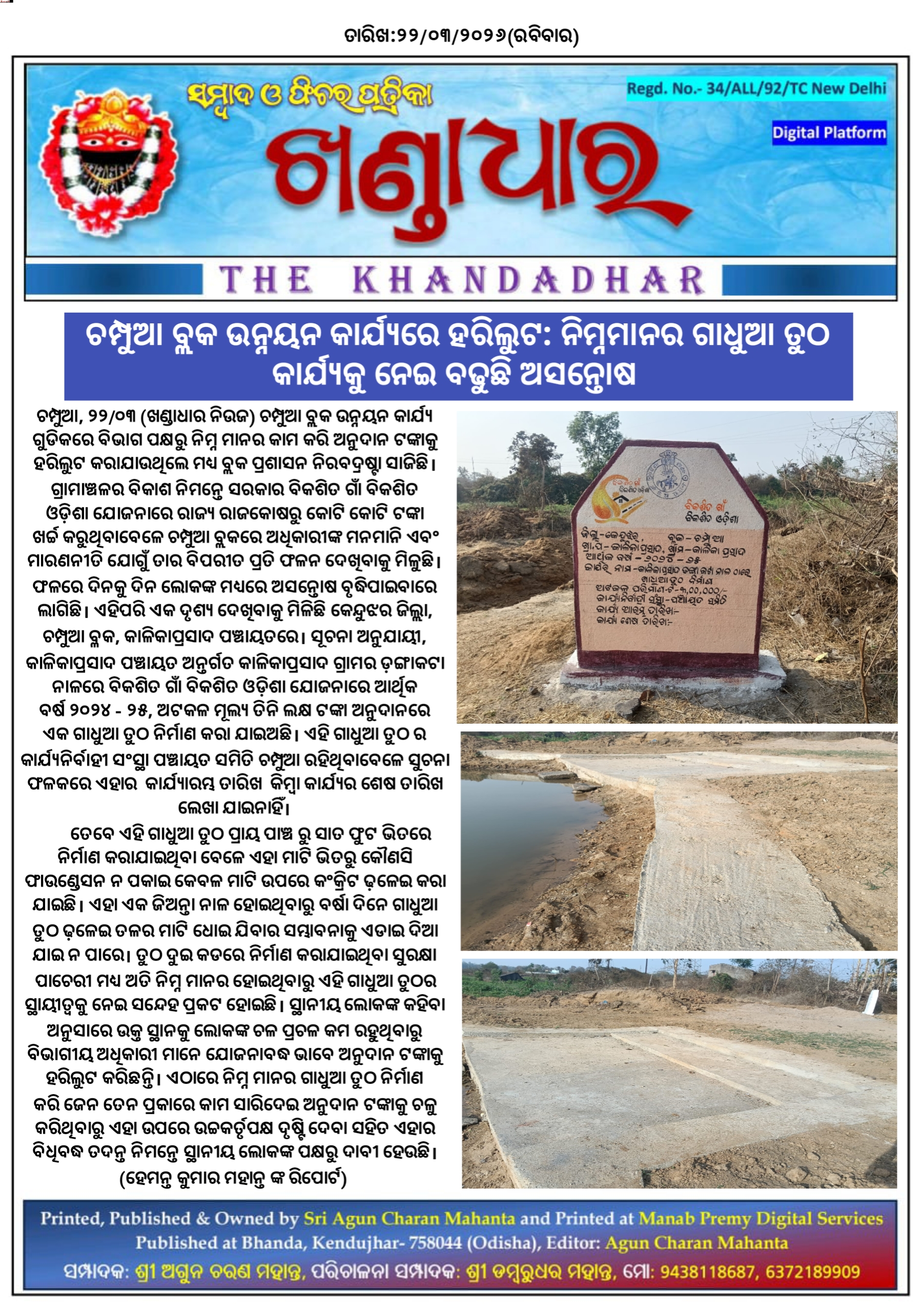 ଚମ୍ପୁଆ, ୨୨/୦୩ (ଖଣ୍ଡାଧାର ନିଉଜ) ଚମ୍ପୁଆ ବ୍ଲକ ଉନ୍ନୟନ କାର୍ଯ୍ୟ ଗୁଡିକରେ ବିଭାଗ ପକ୍ଷରୁ ନିମ୍ନ ମାନର କାମ କରି ଅନୁଦାନ ଟଙ୍କାକୁ ହରିଲୁଟ କରାଯାଉଥିଲେ ମଧ୍ୟ ବ୍ଲକ ପ୍ରଶାସନ ନିରବଦ୍ରଷ୍ଟା ସାଜିଛି। ଗ୍ରାମାଞ୍ଚଳର ବିକାଶ ନିମନ୍ତେ ସରକାର ବିକଶିତ ଗାଁ ବିକଶିତ ଓଡ଼ିଶା ଯୋଜନାରେ ରାଜ୍ୟ ରାଜକୋଷରୁ କୋଟି କୋଟି ଟଙ୍କା ଖର୍ଚ୍ଚ କରୁଥିବାବେଳେ ଚମ୍ପୁଆ ବ୍ଲକରେ ଅଧିକାରୀଙ୍କ ମନମାନି ଏବଂ ମାରଣନୀତି ଯୋଗୁଁ ତାର ବିପରୀତ ପ୍ରତି ଫଳନ ଦେଖିବାକୁ ମିଳୁଛି। ଫଳରେ ଦିନକୁ ଦିନ ଲୋକଙ୍କ ମଧ୍ୟରେ ଅସନ୍ତୋଷ ବୃଦ୍ଧିପାଇବାରେ ଲାଗିଛି। ଏହିପରି ଏକ ଦୃଶ୍ୟ ଦେଖିବାକୁ ମିଳିଛି କେନ୍ଦୁଝର ଜିଲ୍ଲା, ଚମ୍ପୁଆ ବ୍ଳକ, କାଳିକାପ୍ରସାଦ ପଞ୍ଚାୟତରେ। ସୂଚନା ଅନୁଯାୟୀ, କାଳିକାପ୍ରସାଦ ପଞ୍ଚାୟତ ଅନ୍ତର୍ଗତ କାଳିକାପ୍ରସାଦ ଗ୍ରାମର ଡ଼ଙ୍ଗାକଟା ନାଳରେ ବିକଶିତ ଗାଁ ବିକଶିତ ଓଡ଼ିଶା ଯୋଜନାରେ ଆର୍ଥିକ ବର୍ଷ ୨୦୨୪ - ୨୫, ଅଟକଳ ମୂଲ୍ୟ ତିନି ଲକ୍ଷ ଟଙ୍କା ଅନୁଦାନରେ ଏକ ଗାଧୁଆ ତୁଠ ନିର୍ମାଣ କରା ଯାଇଅଛି। ଏହି ଗାଧୁଆ ତୁଠ ର କାର୍ଯ୍ୟନିର୍ବାହୀ ସଂସ୍ଥା ପଞ୍ଚାୟତ ସମିତି ଚମ୍ପୁଆ ରହିଥିବାବେଳେ ସୁଚନା ଫଳକରେ ଏହାର କାର୍ଯ୍ୟାରମ୍ଭ ତାରିଖ କିମ୍ବା କାର୍ଯ୍ୟର ଶେଷ ତାରିଖ ଲେଖା ଯାଇନାହିଁ।