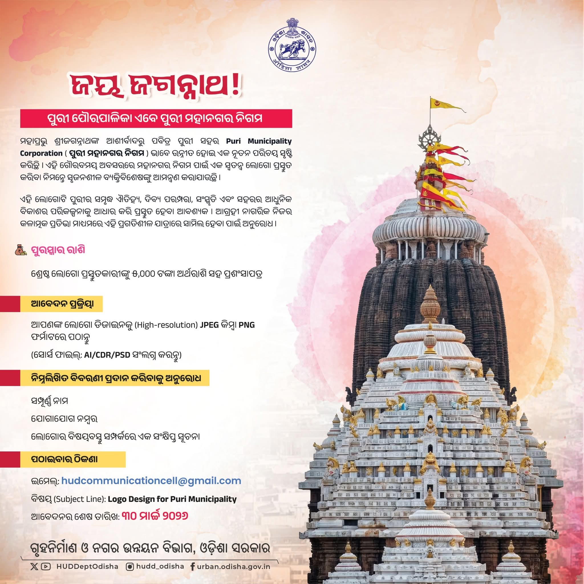 ପୁରୀ ପୌରପାଳିକା ଏବେ ପୁରୀ ମହାନଗର ନିଗମ। ଏହି ଗୌରବମୟ ଅବସରରେ ମହାନଗର ନିଗମ ପାଇଁ ଏକ ସ୍ୱତନ୍ତ୍ର ଲୋଗୋ ପ୍ରସ୍ତୁତ କରିବାକୁ ସୃଜନଶୀଳ ନାଗରିକଙ୍କୁ ଆମନ୍ତ୍ରଣ କରାଯାଉଛି।