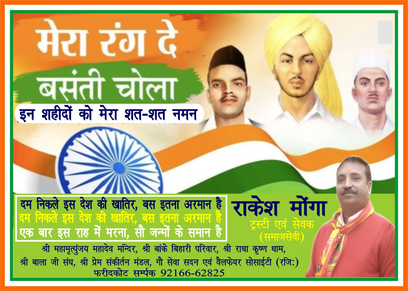 शहीद दिवस के पावन अवसर पर हम महान क्रांतिकारी भगत सिंह,राजगुरु और सुखदेव को श्रद्धा-सुमन अर्पित करते हैं-*राकेश मोंगा*