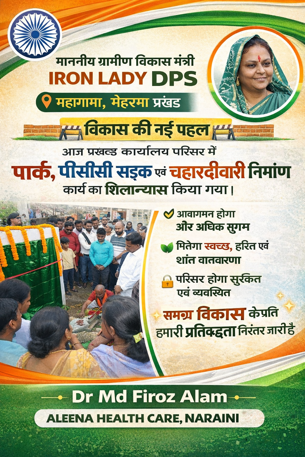 महागामा के मेहरमा प्रखंड कार्यालय परिसर में आज माननीय ग्रामीण विकास मंत्री IRON LADY DPS द्वारा पार्क, पीसीसी सड़क एवं चहारदीवारी निर्माण कार्य का शिलान्यास किया गया।