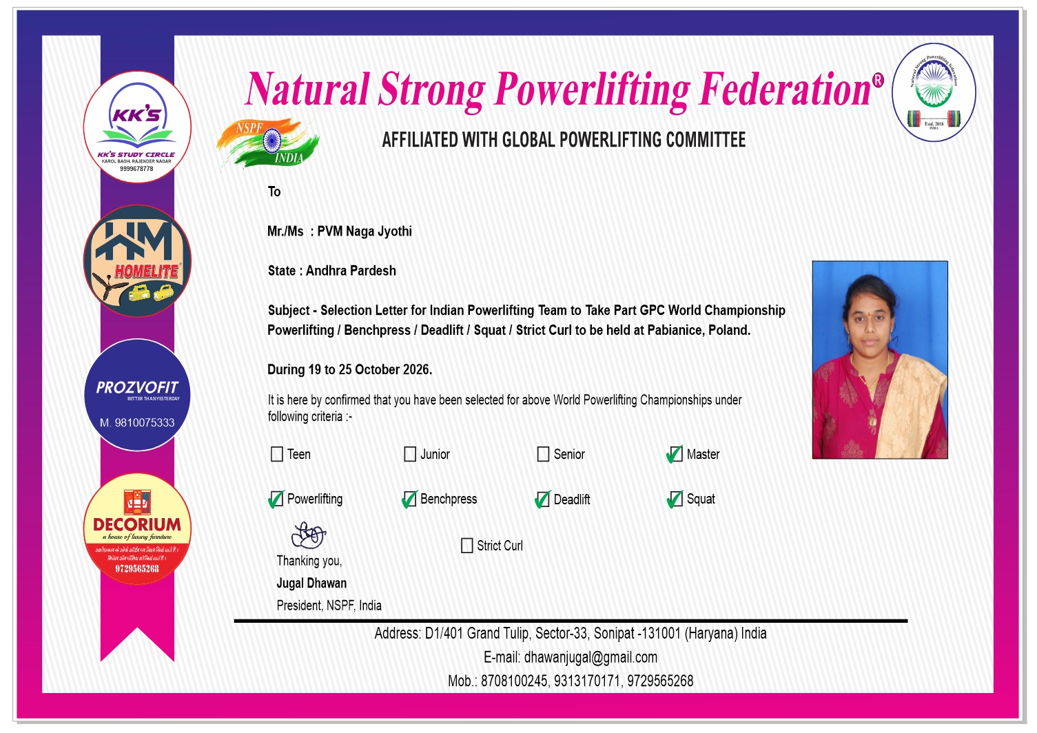 హర్యానా రాష్ట్రంలోని సోనిపట్‌ లో 22-03-2026 తేదీన NSPF (నాచురల్ స్ట్రాంగ్ పవర్ లిఫ్టింగ్ ఫెడరేషన్) ఆధ్వర్యంలో జరిగిన GPC ప్రపంచ పవర్ లిఫ్టింగ్ పోటీలకు సంబంధించిన సెలక్షన్ ట్రయల్స్ నిర్వహించబడ్డాయి. దేశంలోని వివిధ రాష్ట్రాలకు చెందిన క్రీడాకారులు పాల్గొన్న ఈ పోటీలలో ఆంధ్రప్రదేశ్ రాష్ట్రానికి చెందిన పవర్ లిఫ్టర్ పి.వి.ఎం నాగజ్యోతి అత్యుత్తమ ప్రతిభ కనబర్చి ప్రపంచ స్థాయి పోటీలకు అర్హత సాధించారు. 🏋️‍♀️👏