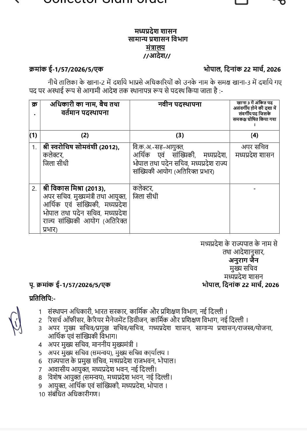 सामान्य प्रशासन विभाग द्वारा भारतीय प्रशासनिक सेवा के अधिकारियों की नवीन पदस्थापना के आदेश जारी