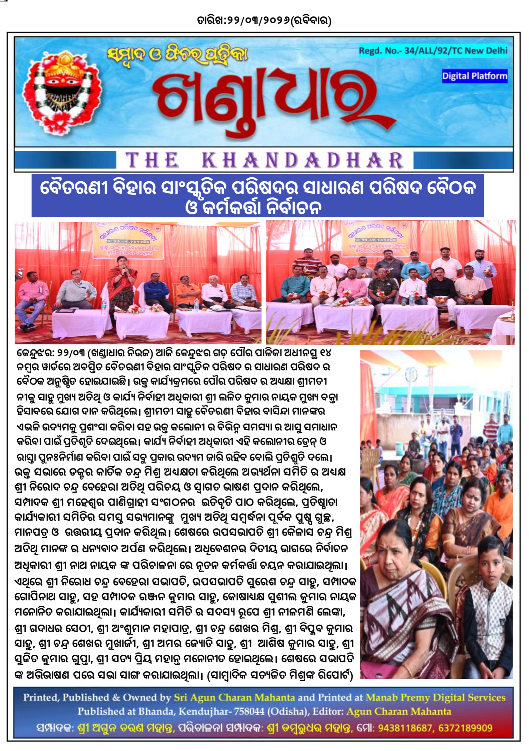 କେନ୍ଦୁଝର: ୨୨.୦୩.୨୦୨୬, ଆଜି କେନ୍ଦୁଝର ଗଡ଼ ପୌର ପାଳିକା ଅଧୀନସ୍ଥ ୧୪ ନମ୍ବର ୱାର୍ଡରେ ଅବସ୍ତିତ ବୈତରଣୀ ବିହାର ସାଂସ୍କୃତିକ ପରିଷଦ ର ସାଧାରଣ ପରିଷଦ ର ବୈଠକ ଅନୁଷ୍ଠିତ ହୋଇଯାଇଛି l ଉକ୍ତ କାର୍ଯ୍ୟକ୍ରମରେ ପୌର ପରିଷଦ ର ଅଧ୍ୟକ୍ଷା ଶ୍ରୀମତୀ ନୀକୁ ସାହୁ ମୁଖ୍ୟ ଅତିଥି ଓ କାର୍ଯ୍ୟ ନିର୍ବାହୀ ଅଧିକାରୀ ଶ୍ରୀ ଲଳିତ କୁମାର ନାୟକ ମୁଖ୍ଯ ବକ୍ତା ହିସାବରେ ଯୋଗ ଦାନ କରିଥିଲେ l ଶ୍ରୀମତୀ ସାହୁ ବୈତରଣୀ ବିହାର ବାସିନ୍ଦା ମାନଙ୍କର ଏଭଳି ଉଦ୍ୟମକୁ ପ୍ରଶଂସା କରିବା ସହ ଉକ୍ତ କଲୋନୀ ର ବିଭିନ୍ନ ସମସ୍ୟା ର ଆସୁ ସମାଧାନ କରିବା ପାଇଁ ପ୍ରତିଶୃତି ଦେଇଥିଲେ l କାର୍ଯ୍ୟ ନିର୍ବାହୀ ଅଧିକାରୀ ଏହି କଲୋନୀର ଡ୍ରେନ୍ ଓ ରାସ୍ତା ପୁନଃନିର୍ମାଣ କରିବା ପାଇଁ ସବୁ ପ୍ରକାର ଉଦ୍ୟମ ଜାରି ରହିବ ବୋଲି ପ୍ରତିଶ୍ରୁତି ଦଲେ l ଉକ୍ତ ସଭାରେ ଡକ୍ଟର କାର୍ତିକ ଚନ୍ଦ୍ର ମିଶ୍ର ଅଧ୍ୟକ୍ଷତା କରିଥିଲେ ଅଭ୍ୟର୍ଥନା ସମିତି ର ଅଧ୍ୟକ୍ଷ ଶ୍ରୀ ନିରୋଦ ଚନ୍ଦ୍ର ବେହେରା ଅତିଥି ପରିଚୟ ଓ ସ୍ଵାଗତ ଭାଷଣ ପ୍ରଦାନ କରିଥିଲେ, ସମ୍ପାଦକ ଶ୍ରୀ ମହେଶ୍ଵର ପାଣିଗ୍ରାହୀ ସଂଗଠନର ଇତିବୃତି ପାଠ କରିଥିଲେ, ପ୍ରତିଷ୍ଠାତା କାର୍ଯ୍ୟକାରୀ ସମିତିର ସମସ୍ତ ସଭ୍ୟମାନଙ୍କୁ ମୁଖ୍ୟ ଅତିଥି ସମ୍ବର୍ଦ୍ଧନା ପୂର୍ବକ ପୁଷ୍ପ ଗୁଚ୍ଛ, ମାନପତ୍ର ଓ ଉତ୍ତରୀୟ ପ୍ରଦାନ କରିଥିଲ l ଶେଷରେ ଉପସଭାପତି ଶ୍ରୀ କୈଳାସ ଚନ୍ଦ୍ର ମିଶ୍ର ଅତିଥି ମାନଙ୍କ ର ଧନ୍ୟବାଦ ଅର୍ପଣ କରିଥିଲେ l ଅଧିବେଶନର ଦିତୀୟ ଭାଗରେ ନିର୍ବାଚନ ଅଧିକାରୀ ଶ୍ରୀ ନାଥ ନାୟକ ଙ୍କ ପରିଚାଳନା ରେ ନୂତନ କର୍ମକର୍ତ୍ତା ଚୟନ କରାଯାଇଥିଲା l ଏଥିରେ ଶ୍ରୀ ନିରୋଧ ଚନ୍ଦ୍ର ବେହେରା ସଭାପତି, ଉପସଭାପତି ସୁରେଶ ଚନ୍ଦ୍ର ସାହୁ, ସମ୍ପାଦକ ଗୋପିନାଥ ସାହୁ, ସହ ସମ୍ପାଦକ ରଞ୍ଜନ କୁମାର ସାହୁ, କୋଷାଧ୍ଯକ୍ଷ ସୁଶୀଲ କୁମାର ନାୟକ ମନୋନିତ କରାଯାଇଥିଲା l କାର୍ଯ୍ୟକାରୀ ସମିତି ର ସଦସ୍ୟ ରୂପେ ଶ୍ରୀ ନୀଳମଣି ଲେଙ୍କା, ଶ୍ରୀ ଗଦାଧର ସେଠୀ, ଶ୍ରୀ ଅଂଶୁମାନ ମହାପାତ୍ର, ଶ୍ରୀ ଚନ୍ଦ୍ର ଶେଖର ମିଶ୍ର, ଶ୍ରୀ ବିପ୍ଳବ କୁମାର ସାହୁ, ଶ୍ରୀ ଚନ୍ଦ୍ର ଶେଖର ମୁଖାର୍ଜୀ, ଶ୍ରୀ ଅମର ଜ୍ୟୋତି ସାହୁ,ଶ୍ରୀ ଆଶିଷ କୁମାର ସାହୁ, ଶ୍ରୀ ସୁଜିତ କୁମାର ଗୁପ୍ତା, ଶ୍ରୀ ସତ୍ୟ ପ୍ରିୟ ମହାନ୍ତ ମନୋନୀତ ହୋଇଥିଲେ l ଶେଷରେ ସଭାପତି ଙ୍କ ଅଭିଭାଷଣ ପରେ ସଭା ସାଙ୍ଗ କରାଯାଇଥିଲା l