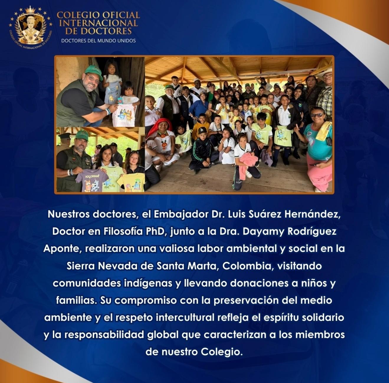 🌿 Social and Environmental Mission in Colombia's Sierra Nevada 🌎 Our doctors—Ambassador Dr. Luis Suárez Hernández (PhD) and Dr. Dayamy Rodríguez Aponte—carried out remarkable work in the Sierra Nevada de Santa Marta, where they represented the Official International College of Doctors with excellence. During their visit, they toured iconic sites and held meaningful meetings with local communities. 🤝 Together, they delivered donations to children and to the indigenous Wiwa people, thereby strengthening bonds of solidarity and sharing moments of intercultural learning. Their presence was received with gratitude, underscoring the humanitarian commitment that characterizes our members. ✨ Their participation reaffirms our institutional purpose: to promote initiatives that uphold human dignity, protect the environment, and strengthen international cooperation. Gestures such as these inspire us to continue building a more conscious, united, and solidarity-driven world.