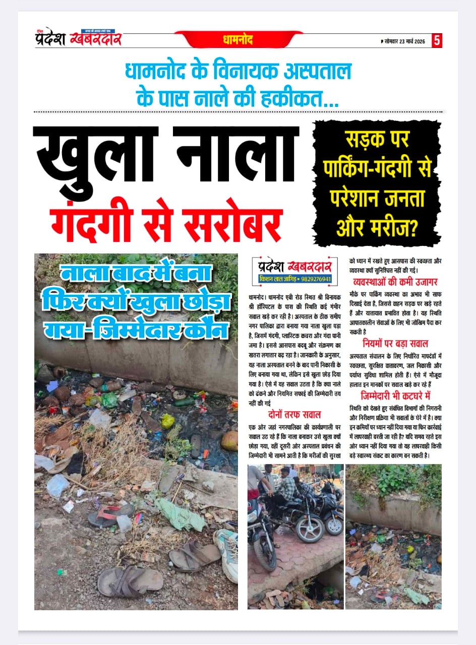 एबी रोड स्थित श्री विनायक श्री हॉस्पिटल के पास की स्थिति कई गंभीर सवाल खड़े कर रही है। अस्पताल के ठीक समीप नगर पालिका द्वारा बनाया गया नाला खुला पड़ा है, जिसमें गंदगी, प्लास्टिक कचरा और गंदा पानी जमा है।