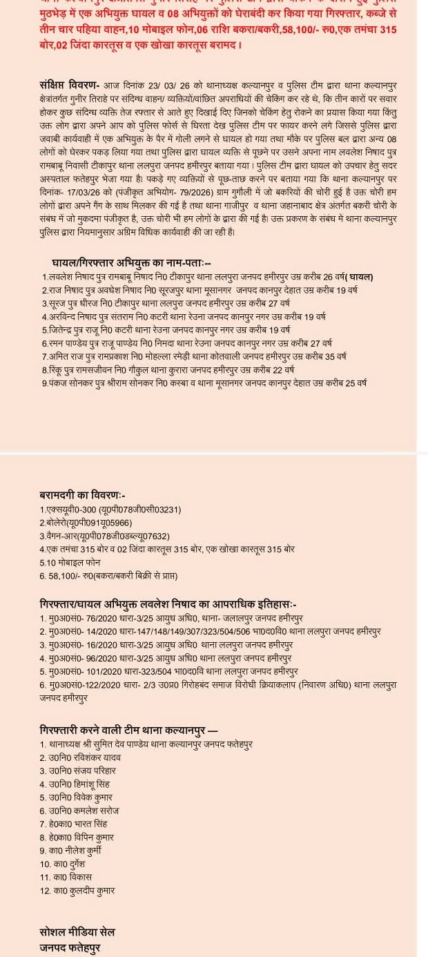 कल्याणपुर में पुलिस-बकरी चोर गिरोह मुठभेड़: 9 गिरफ्तार, 1 घायल