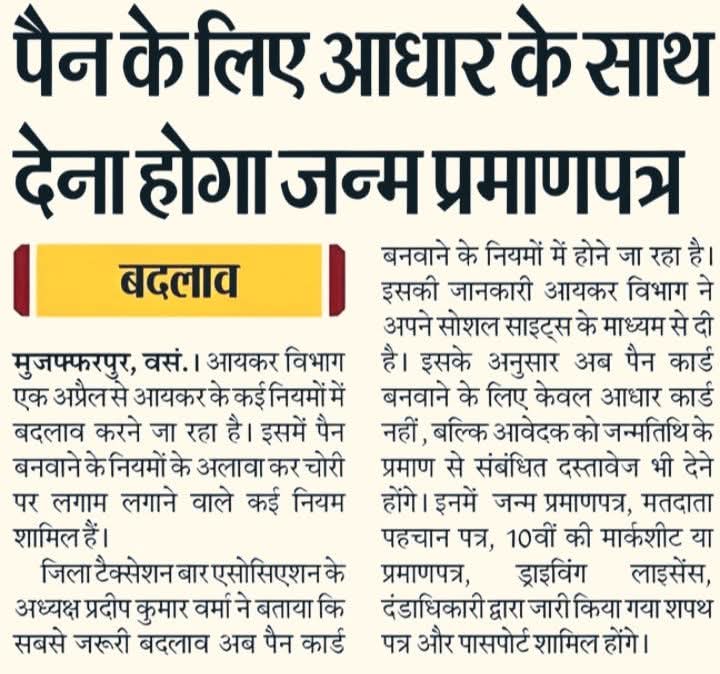 पैन कार्ड बनवाने की प्रक्रिया में एक अहम बदलाव सामने आया है। अब केवल आधार कार्ड के आधार पर पैन बनवाना पर्याप्त नहीं होगा, बल्कि आवेदक को जन्म प्रमाण पत्र भी प्रस्तुत करना अनिवार्य किया जा रहा है।