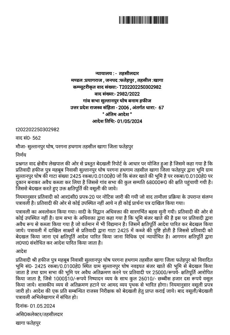 खागा / फतेहपुर। तहसीलदार न्यायालय, खागा द्वारा सुल्तानपुर घोष गांव में ग्राम सभा की भूमि पर अवैध कब्जे के मामलों में हफीज पुत्र महबूब हसन दो अलग-अलग अंतिम आदेश जारी करते हुए आरोपित के खिलाफ बेदखली और जुर्माने की कार्रवाई के निर्देश दिए गए हैं। दोनों मामलों में राजस्व टीम की रिपोर्ट और साक्ष्यों के आधार पर कब्जा साबित पाया गया।