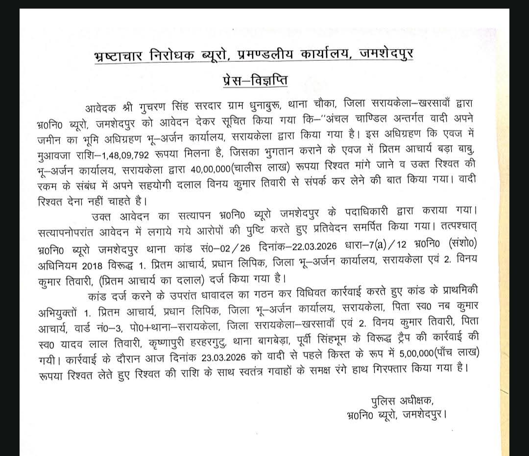 सरायकेला-खरसावां: भ्रष्टाचार के खिलाफ बड़ी कार्रवाई करते हुए भ्रष्टाचार निरोधक ब्यूरो (ACB) ने भू-अर्जन विभाग के बड़ा बाबू प्रीतम कुमार आचार्य और दलाल विनय कुमार तिवारी को 5 लाख रुपये घूस लेते रंगे हाथ गिरफ्तार किया है।