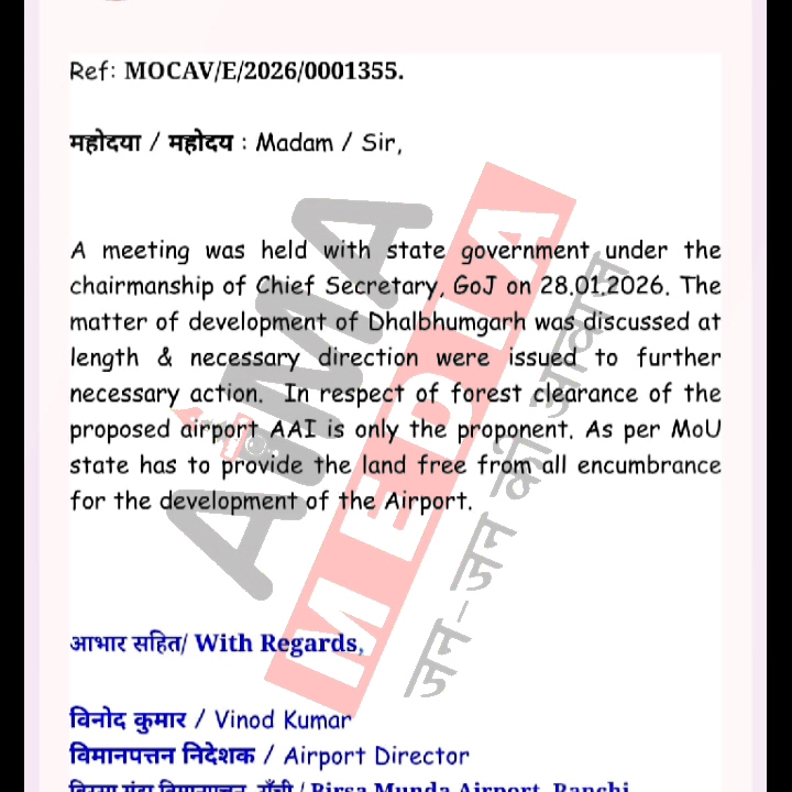 एयरपोर्ट निदेशक, बिरसा मुंडा एयरपोर्ट, रांची के विनोद कुमार ने जानकारी देते हुए बताया कि राज्य सरकार और एएआई के बीच हुए समझौता ज्ञापन (MoU) के तहत यह स्पष्ट प्रावधान है कि राज्य सरकार को हवाई अड्डे के विकास के लिए सभी प्रकार के अवरोधों से मुक्त भूमि उपलब्ध करानी होगी। उन्होंने कहा कि भूमि अधिग्रहण और उससे जुड़े सभी विवादों का समाधान समयबद्ध तरीके से करना बेहद आवश्यक है, ताकि परियोजना सुचारू रूप से आगे बढ़ सके।