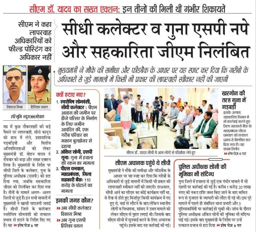 मुख्यमंत्री डॉ. मोहन यादव ने कलेक्टर सीधी और गुना एसपी को हटाने के दिए निर्देश