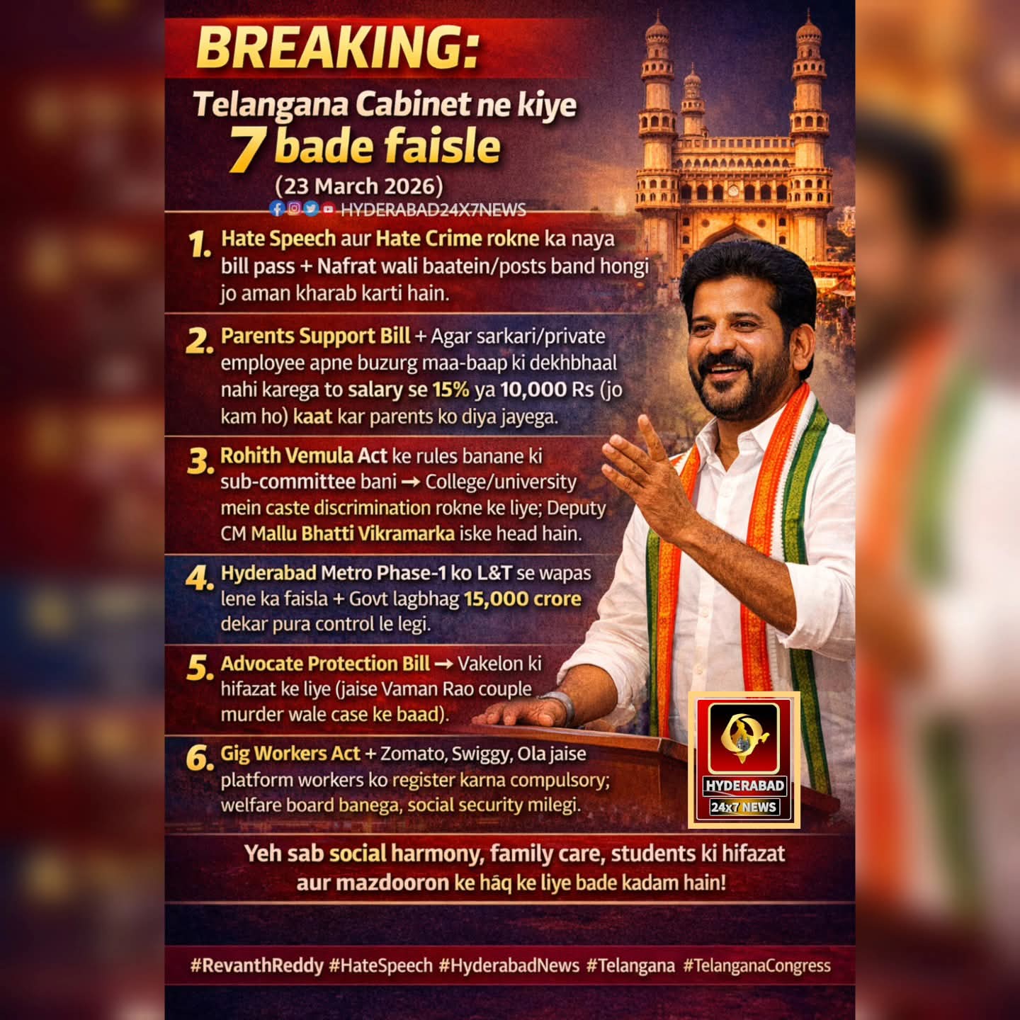 >> Cabinet approved the Telangana Platform-Based Gig Workers (Registration, Social Security and Welfare) Act, 2026. The bill provides for mandatory worker registration, creation of a Welfare Board, and a dedicated welfare fund. It ensures legal recognition, social security, and protection of rights for gig workers. The bill includes minor revisions to align with the Centre’s Social Security Code.