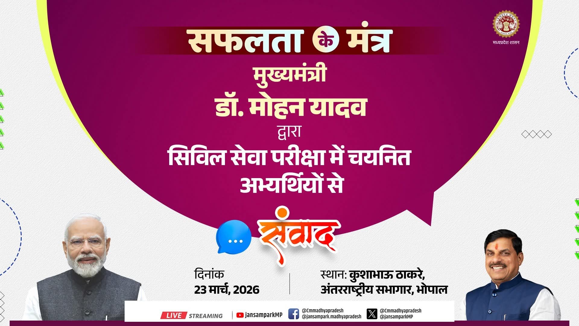 मुख्‍यमंत्री डॉ. मोहन यादव #यूपीएससी परीक्षा में चयनित होकर देश भर में प्रदेश का नाम रोशन करने वाले 61 अभ्यर्थियों से आज करेंगे संवाद