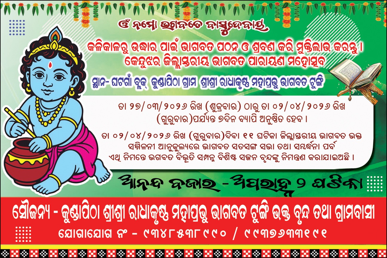 କେନ୍ଦୁଝର,୨୩/୩ : ସ୍ଥାନୀୟ ଘଟଗାଁ ବ୍ଲକ ଅନ୍ତର୍ଗତ ବଡ଼ଜାମୁପଶି ଗ୍ରାମ ପଞ୍ଚାୟତର କୁଣ୍ଡପିଠା ଗ୍ରାମରେ ଶ୍ରୀ ଶ୍ରୀ ରାଧାକୃଷ୍ଣ ମହାପ୍ରଭୁ ଭାଗବତ ଟୁଙ୍ଗୀ ତରଫରୁ ଆସନ୍ତା ତା ୨୭.୩.୨୦୨୬ ରିଖ ଶୁକ୍ରବାର ଠାରୁ ତା ୨.୪.୨୦୨୬ ରିଖ ଗୁରୁବାର ପର୍ଯ୍ଯନ୍ତ ସାତଦିନ ବ୍ୟାପୀ ଭାଗବତ ପାରାୟଣ ମହୋତ୍ସବ ଅନୁଷ୍ଠିତ ହେବାକୁ ଯାଉଅଛି।