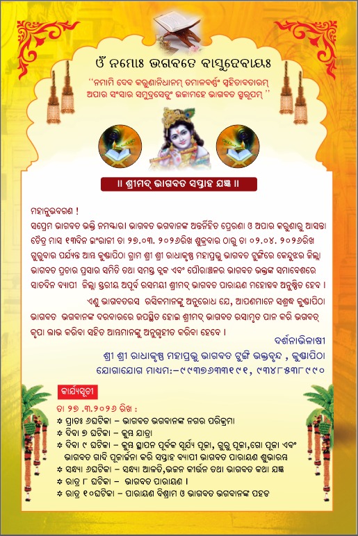 ପବିତ୍ର ରାମନବମୀର ପୂର୍ବଦିନ ତା ୨୬.୩.୨୦୨୬ ରିଖ ଗୁରୁବାର ଦିନ ଶୁଭ ଅଧିବାସ ଅବସରରେ କଳସ ଯାତ୍ରା କରାଯାଇ ଷୋଡ଼ଶ ଉପଚାରରେ ଯଥାବିଧି ପୂଜାର୍ଚ୍ଚନା ଆରମ୍ଭ ହେବ।ତା ୨୭.୩.୨୦୨୬ ରିଖ ଠାରୁ ପ୍ରତ୍ୟହ ପଞ୍ଚୋପଚାରରେ ପୂଜାର୍ଚ୍ଚନା କରାଯାଇ ଭାଗବତ ପଠନର ବିଧିମତେ କାର୍ଯ୍ୟକ୍ରମ ଚାଲିବ ଏବଂ ପ୍ରତ୍ୟହ ସନ୍ଧ୍ୟା ଆଳତି ପରେ ପରେ କେନ୍ଦୁଝର ଜିଲ୍ଲାର ଭାଗବତ ପ୍ରଚାର ପ୍ରସାର ସମିତିର ମନୋନୟନ କ୍ରମେ ବିଭିନ୍ନ ବ୍ଲକର ଭାଗବତ ପ୍ରବଚକ ବୃନ୍ଦ ଙ୍କ ଦ୍ବାରା ଭାଗବତର ବିଷୟବସ୍ତୁ ଉପରେ ଆଲୋଚନାଚକ୍ର ଜାରି ରହିବ। ଏହି କାର୍ଯ୍ୟକ୍ରମରେ କେନ୍ଦୁଝର ଜିଲ୍ଲା ଭାଗବତ ପ୍ରଚାର ପ୍ରସାର ସମିତିର ସଭାପତି ଆଚାର୍ଯ୍ୟ ଦାଶରଥି ପ୍ରଧାନ ସାତଦିନ ବ୍ୟାପୀ ଉପସ୍ଥିତ ରହିବାକୁ ସମ୍ମତି ପ୍ରଦାନ କରିଛନ୍ତି। ଅନୁଷ୍ଠାନର ସଭାପତି ପଦ୍ମନାଭ ପଲେଇ ଓ ସଦସ୍ୟ ନକୁଳ ଚନ୍ଦ୍ର ପଲେଇ ସଂକଳ୍ପ କରିବାକୁ ଥିବା ବେଳେ ଘଟଗାଁ ବ୍ଲକ୍ ଅନ୍ତର୍ଗତ ଖୁଣ୍ଟାପଡା ରୁ ଅଭିଜିତ ପଣ୍ଡା (ମଣ୍ଟୁ ନନା) ଓ ତାଙ୍କର ସାଥୀ ଏବଂ ଘଟଗାଁର କେଶବ ଚନ୍ଦ୍ର ଆଚାର୍ଯ୍ୟ ପୁରୋହିତ କର୍ମକାଣ୍ଡ କରିବାକୁ ଯାଉଛନ୍ତି। ଶେଷ ଦିବସରେ ଅର୍ଥାତ୍ ତା ୨.୪.୨୦୨୬ ରିଖ ଗୁରୁବାର ଦିନ କେନ୍ଦୁଝର ଜିଲ୍ଲାସ୍ତରୀୟ ଭାଗବତ ଭକ୍ତ ଓ ନିମନ୍ତ୍ରିତ ବନ୍ଧୁ ମାନଂକୁ ନେଇ ସମାବେଶରେ ଭାଗବତ ଆଲୋଚନାଚକ୍ର ଅନୁଷ୍ଠିତ ହେବ। ଏହି ଆଲୋଚନାରେ ମୁଖ୍ୟ ଅତିଥି ରୂପେ କେନ୍ଦୁଝର ଜିଲ୍ଲା ଭାଗବତ ପ୍ରଚାର ପ୍ରସାର ସମିତିର ସଭାପତି ଆଚାର୍ଯ୍ୟ ଦାଶରଥି ପ୍ରଧାନ, ମୁଖ୍ୟ ବକ୍ତା ରୂପେ କିଆପଦା ଯାଜପୁରର ଭାଗବତ ପ୍ରବଚକ ପଣ୍ଡିତ ଆଦିକନ୍ଦ ଦାସ, ସମ୍ମାନିତ ଅତିଥି ରୂପେ ଘଟଗାଁ ଗୋଷ୍ଠୀ ଉନ୍ନୟନ ଅଧିକାରୀ ଖଗେଶ୍ବର ବରାଳ, କେନ୍ଦୁଝର ଜିଲ୍ଲା ଯାଦବ ମହାସଭାର ସଭାପତି ପ୍ରଦୀପ କୁମାର ବାରିକ, ଘଟଗାଁ ବ୍ଲକ୍ ଭାଗବତ ପ୍ରଚାର ପ୍ରସାର ସମିତିର ସଭାପତି ଜୟଦେବ ପଣ୍ଡା, କେନ୍ଦୁଝର ଜିଲ୍ଲା ଭାଗବତ ପ୍ରଚାର ପ୍ରସାର ସମିତିର ସଂପାଦକ ଜଗନ୍ନାଥ ଜେନା, ସମ୍ମାନିତ ବକ୍ତା ଭାବେ ତାରିଣୀ ଠାକୁରାଣୀ ମହାବିଦ୍ୟାଳୟ ଘଟଗାଁର ଅବସରପ୍ରାପ୍ତ ଅଧ୍ୟକ୍ଷ ଡ଼. ରଞ୍ଜନ କୁମାର ପଣ୍ଡା ଯୋଗଦେବାକୁ ସମ୍ମତି ଜଣାଇଥିବା ବେଳେ ପୌରୋହିତ୍ୟ କରିବେ ଅନୁଷ୍ଠାନର ସଭାପତି ପଦ୍ମନାଭ ପଲେଇ। ଭଗବତ୍ ବିଭୁତି ସମ୍ପନ୍ନ ବିଶିଷ୍ଟ ସଜ୍ଜନ ମାନଙ୍କ ଅତି ଦୁର୍ଲ୍ଲଭ ସମାଗମରେ ସାତଦିନ ବ୍ୟାପୀ ଅପୂର୍ବ ରସମୟୀ ଶ୍ରୀମଦ୍ ଭାଗବତ ପଠନ ଓ ଶ୍ରବଣ କାର୍ଯ୍ୟକ୍ରମରେ ଆପଣମାନଙ୍କ ପରି ଭାଗବତ ରସର ରସିକ ମାନେ ବହୁ ସଂଖ୍ୟାରେ ସଶ୍ରଦ୍ଧ ଉପସ୍ଥିତ ହୋଇ ଭାଗବତ ରସାମୃତ ଆସ୍ବାଦନ କରିବା ପାଇଁ କୁଣ୍ଡାପିଠା ଶ୍ରୀ ଶ୍ରୀ ରାଧାକୃଷ୍ଣ ମହାପ୍ରଭୁ ଭାଗବତ ଟୁଙ୍ଗୀ ଭକ୍ତ ତଥା ଗ୍ରାମବାସୀମାନେ ଦୃଢ ଆଶା କରିଛନ୍ତି। ଯଦି ଆପଣମାନଙ୍କ ବିଶେଷ ଅବକାଶ ନଥାଏ ତେବେ ଉଦଯାପନ ଦିବସ ଅର୍ଥାତ୍ ତା ୨.୪.୨୦୨୬ ରିଖ ଗୁରୁବାର ଦିନ ଜିଲ୍ଲାସ୍ତରୀୟ ଭାଗବତ ଭକ୍ତ ସମାବେଶରେ ଯୋଗଦାନ କରି ଭାଗବତ ଭଗବାନଙ୍କ କୃପା ଲାଭ କରିବା ପାଇଁ ଟୁଙ୍ଗୀ ତରଫରୁ ଆପଣମାନଙ୍କୁ ଆମନ୍ତ୍ରଣ କରୁଅଛୁ । କାରଣ ଏଠାରେ ଗୋଟିଏ କ୍ଷଣ ମଧ୍ୟ ଦୁର୍ଲ୍ଲଭ ଅଟେ।