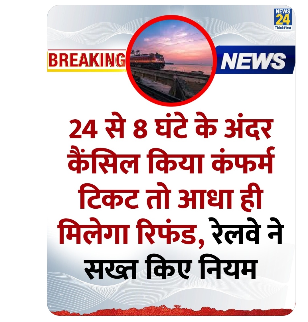 24 ଘଣ୍ଟାରୁ 8 ଘଣ୍ଟା ମଧ୍ୟରେ କେନ୍ସଲ୍ ଟିକଟ ପାଇଁ ମିଳିବ ଅଧା ଟଙ୍କା ଫେରସ୍ତ। ରେଳ ବିଭାଗ ତରଫ ରୁ ନିୟମ ଜାରି କରାଗଲା।