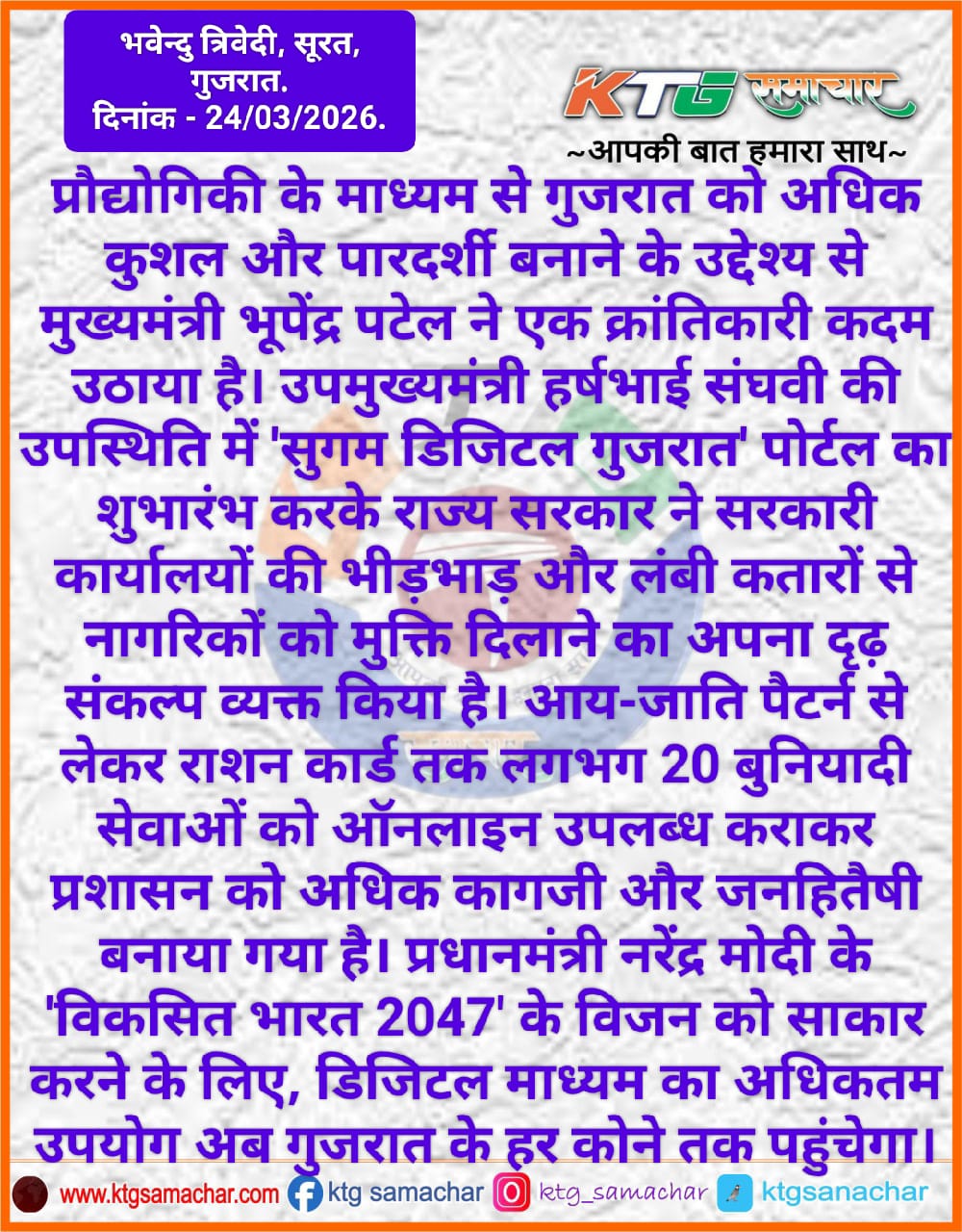 उप मुख्यमंत्री हर्ष संघवी की उपस्थिति में "सुगम डिजिटल गुजरात" पोर्टल का शुभारंभ करके राज्य सरकार ने सरकारी कार्यालय में भीड़भाड़ और लंबी कतारों से नागरिकों को मुक्ति दिलाने का अपना दृढ़ संकल्प व्यक्त किया है।