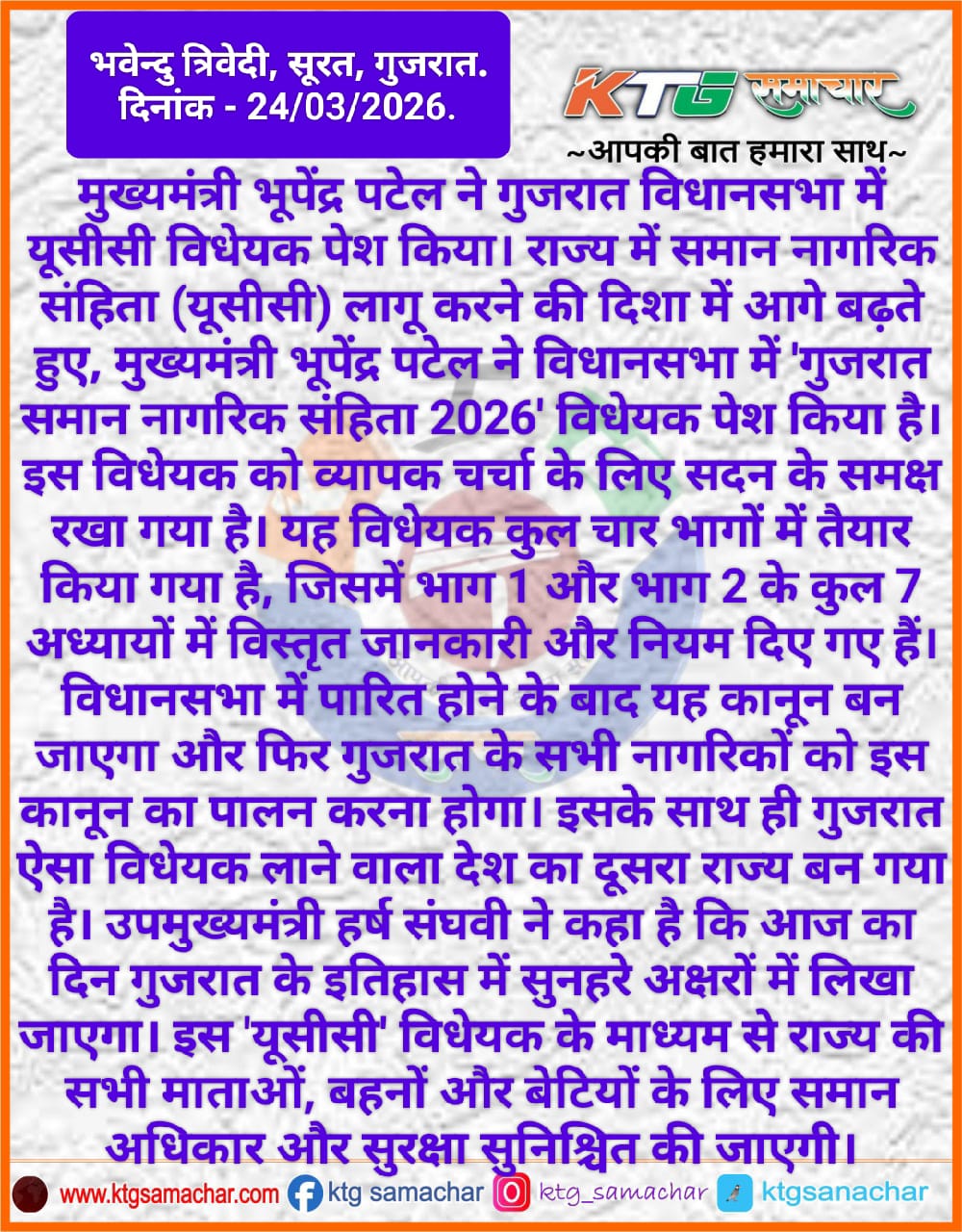 राज्य में समान नागरिक संहिता लागू करने की दिशा में आगे बढ़ते हुए मुख्यमंत्री भूपेंद्र पटेल ने विधानसभा में 'गुजरात समान नागरिक संहिता 2026' विधेयक पेश किया है।