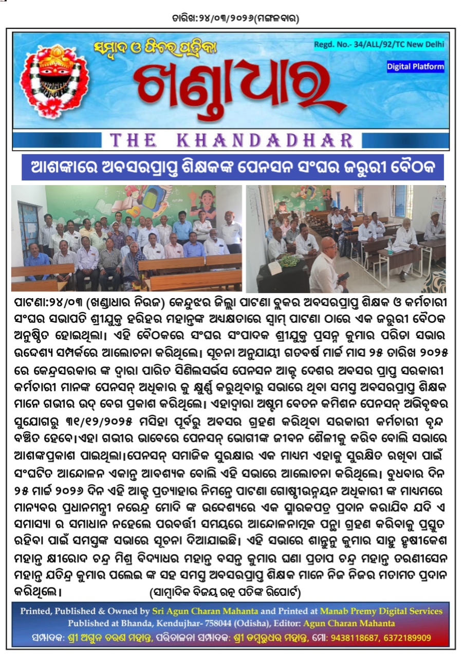 ପାଟଣା:୨୪/୦୩, କେନ୍ଦୁଝର ଜିଲ୍ଲା ପାଟଣା ବ୍ଲକର ଅବସରପ୍ରାପ୍ତ ଶିକ୍ଷକ ଓ କର୍ମଚାରୀ ସଂଘର ସଭାପତି ଶ୍ରୀଯୁକ୍ତ ହରିହର ମହାନ୍ତଙ୍କ ଅଧ୍ୟକ୍ଷତାରେ ସ୍ୱାମ୍ ପାଟଣା ଠାରେ ଏକ ଜରୁରୀ ବୈଠକ ଅନୁଷ୍ଠିତ ହୋଇଥିଲା।ଏହି ବୈଠକରେ ସଂଘର ସଂପାଦକ ଶ୍ରୀଯୁକ୍ତ ପ୍ରସନ୍ନ କୁମାର ପରିଡା ସଭାର ଉଦ୍ଦେଶ୍ୟ ସମ୍ପର୍କରେ ଆଲୋଚନା କରିଥିଲେ। ସୂଚନା ଅନୁଯାୟୀ ଗତବର୍ଷ ମାର୍ଚ୍ଚ ମାସ ୨୫ ତାରିଖ ୨୦୨୫ ରେ କେନ୍ଦ୍ରସରକାର ଙ୍କ ଦ୍ଵାରା ପାରିତ ସିଣିଲସର୍ଭସ ପେନସନ ଆକ୍ଟ ଦେଶର ଅବସର ପ୍ରାପ୍ତ ସରକାରୀ କର୍ମଚାରୀ ମାନଙ୍କ ପେନସନ୍ ଅଧିକାର କୁ କ୍ଷୁର୍ଣ୍ଣ କରୁଥିବାରୁ ସଭାରେ ଥିବା ସମସ୍ତ ଅବସରପ୍ରାପ୍ତ ଶିକ୍ଷକ ମାନେ ଗଭୀର ଉଦ୍ ବେଗ ପ୍ରକାଶ କରିଥିଲେ।ଏହାଦ୍ବାରା ଅଷ୍ଟମ ବେତନ କମିଶନ ପେନସନ୍ ଅଭିବୃଦ୍ଧର ସୁଯୋଗରୁ ୩୧/୧୨/୨୦୨୫ ମସିହା ପୂର୍ବରୁ ଅବସର ଗ୍ରହଣ କରିଥିବା ସରକାରୀ କର୍ମଚାରୀ ବୃନ୍ଦ ବଞ୍ଚିତ ହେବେ।ଏହା ଗଭୀର ଭାବେରେ ପେନସନ୍ ଭୋଗୀଙ୍କ ଜୀବନ ଶୈଳୀକୁ କରିବ ବୋଲି ସଭାରେ ଆଶଙ୍କପ୍ରକାଶ ପାଇଥିଲା।ପେନସନ୍ ସମାଜିକ ସୁରକ୍ଷାର ଏକ ମାଧ୍ୟମ ଏହାକୁ ସୁରକ୍ଷିତ ରଖିବା ପାଇଁ ସଂଘଟିତ ଆନ୍ଦୋଳନ ଏକାନ୍ତ ଆବଶ୍ୟକ ବୋଲି ଏହି ସଭାରେ ଆଲୋଚନା କରିଥିଲେ। ବୁଧବାର ଦିନ ୨୫ ମାର୍ଚ୍ଚ ୨୦୨୬ ଦିନ ଏହି ଆକ୍ଟ ପ୍ରତ୍ୟାହାର ନିମନ୍ତେ ପାଟଣା ଗୋଷ୍ଠୀଉନ୍ନୟନ ଅଧିକାରୀ ଙ୍କ ମାଧ୍ୟମରେ ମାନ୍ୟବର ପ୍ରଧାନମନ୍ତ୍ରୀ ନରେନ୍ଦ୍ର ମୋଦି ଙ୍କ ଉଦ୍ଦେଶ୍ୟରେ ଏକ ସ୍ମାରକପତ୍ର ପ୍ରଦାନ କରାଯିବ ଯଦି ଏ ସମାସ୍ୟା ର ସମାଧାନ ନହେଲେ ପରବର୍ତ୍ତୀ ସମୟରେ ଆନ୍ଦୋଳନାତ୍ମକ ପନ୍ଥା ଗ୍ରହଣ କରିବାକୁ ପ୍ରସ୍ତୁତ ରହିବା ପାଇଁ ସମସ୍ତଙ୍କ ସଭାରେ ସୂଚନା ଦିଆଯାଇଛି।ଏହି ସଭାରେ ଶାନ୍ତୁନୁ କୁମାର ସାହୁ ହୃଷୀକେଶ ମହାନ୍ତ କ୍ଷୀରୋଦ ଚନ୍ଦ୍ର ମିଶ୍ର ବିଦ୍ୟାଧର ମହାନ୍ତ ବସନ୍ତ କୁମାର ଘଣା ପ୍ରତାପ ଚନ୍ଦ୍ର ମହାନ୍ତ ତରଣୀସେନ ମହାନ୍ତ ଯତିନ୍ଦ୍ର କୁମାର ପଲେଇ ଙ୍କ ସହ ସମସ୍ତ ଅବସରପ୍ରାପ୍ତ ଶିକ୍ଷକ ମାନେ ନିଜ ନିଜର ମତାମତ ପ୍ରଦାନ କରିଥିଲେ।