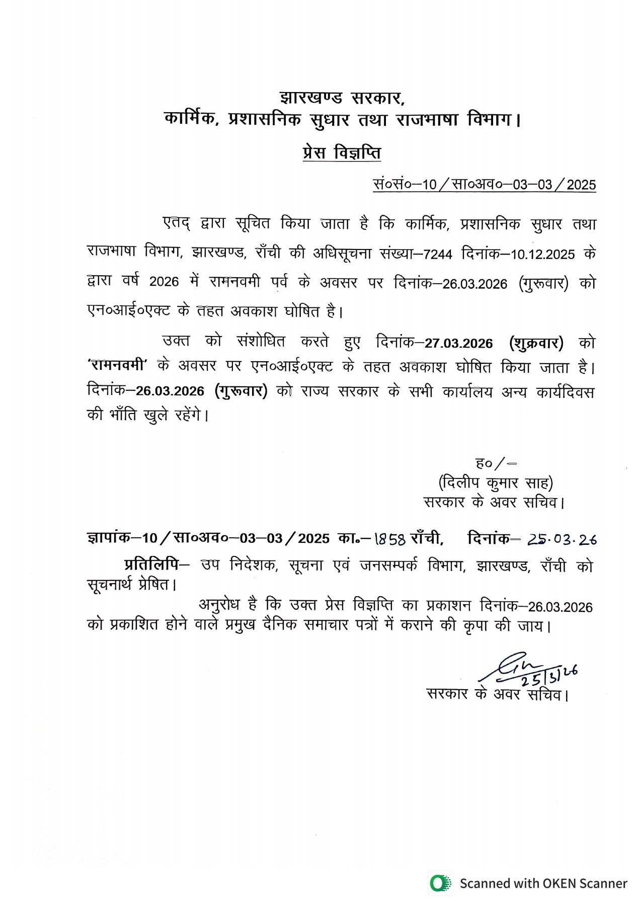विभाग की ओर से जारी प्रेस विज्ञप्ति के अनुसार पहले 26 मार्च 2026 (गुरुवार) को अवकाश घोषित किया गया था, जिसे अब संशोधित करते हुए 27 मार्च 2026 (शुक्रवार) को रामनवमी का अवकाश घोषित किया गया है।